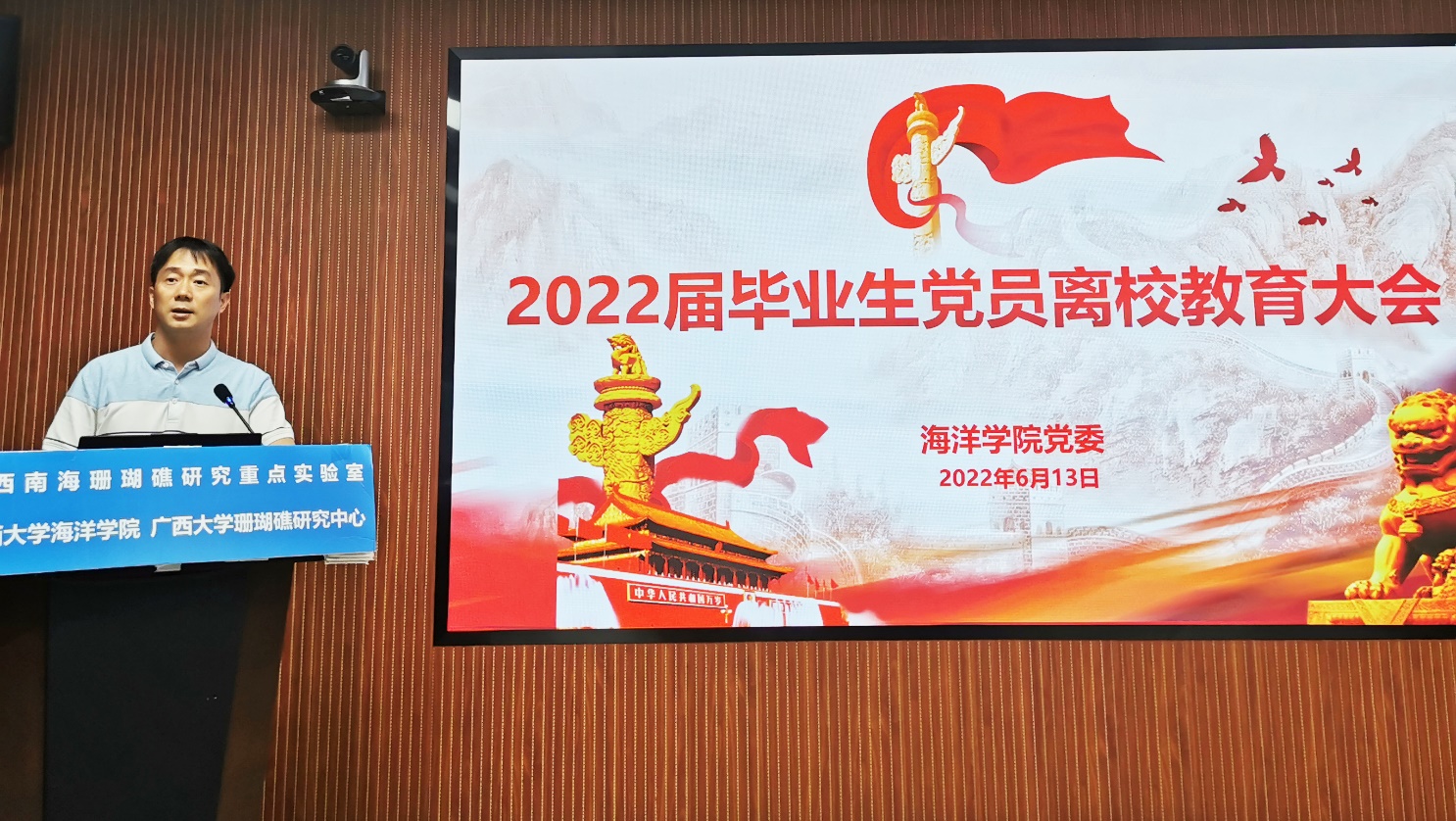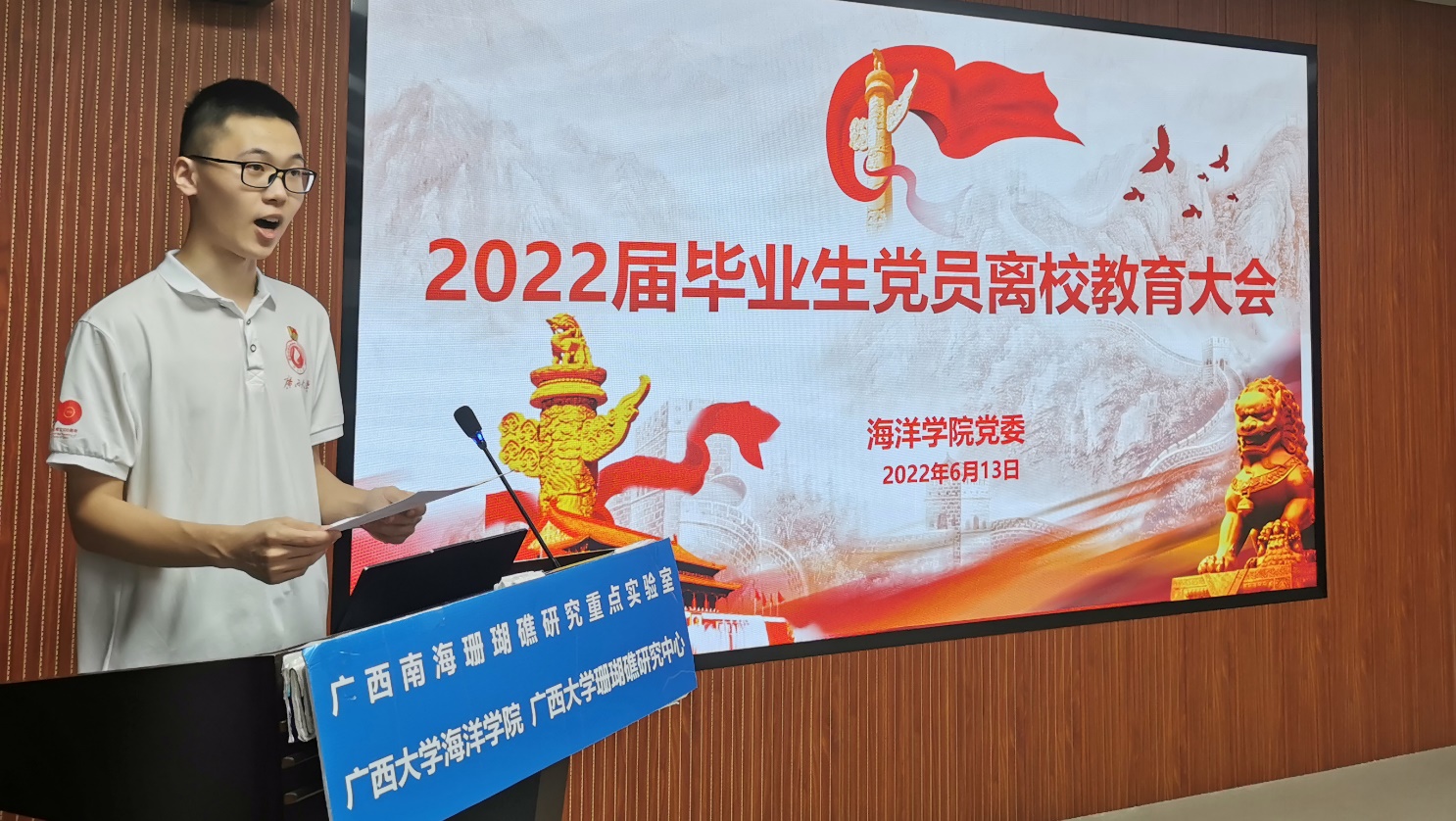 2018级海洋科学专业赵博义同志代表全体毕业生党员发言。他回顾了四年的大学生活,感谢学校、学院对全体党员的培养,号召广大毕业生党员坚定理想信念,坚守党员责任,坚持西大本色,胸怀祖国、脚踏实地、担当作为,做勇立潮头的奋斗者,在新的岗位上继续发挥先锋模范带头作用,用努力和成功来回报社会、回报母校。