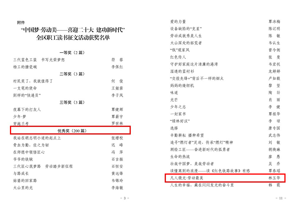 为喜迎党的二十大胜利召开,加强新时代职工文化建设,激发全区各族职工奋进新征程、建功新时代,自治区总工会举办了“中国梦·劳动美——喜迎二十大 建功新时代”全区职工读书征文活动。征文活动得到了全区各级工会和各族职工的积极响应,共征集到作品 2700 多篇。参赛作品紧扣主题,大力弘扬劳模精神、劳动精神、工匠精神,弘扬清廉家风,充分展现了全区各族职工踔厉奋发、勇毅前行的昂扬风貌。经组织评审,共评出一等奖 2 篇、二等奖 3 篇、三等奖 3 篇,优秀奖 200 篇,优秀组织奖 6 个。