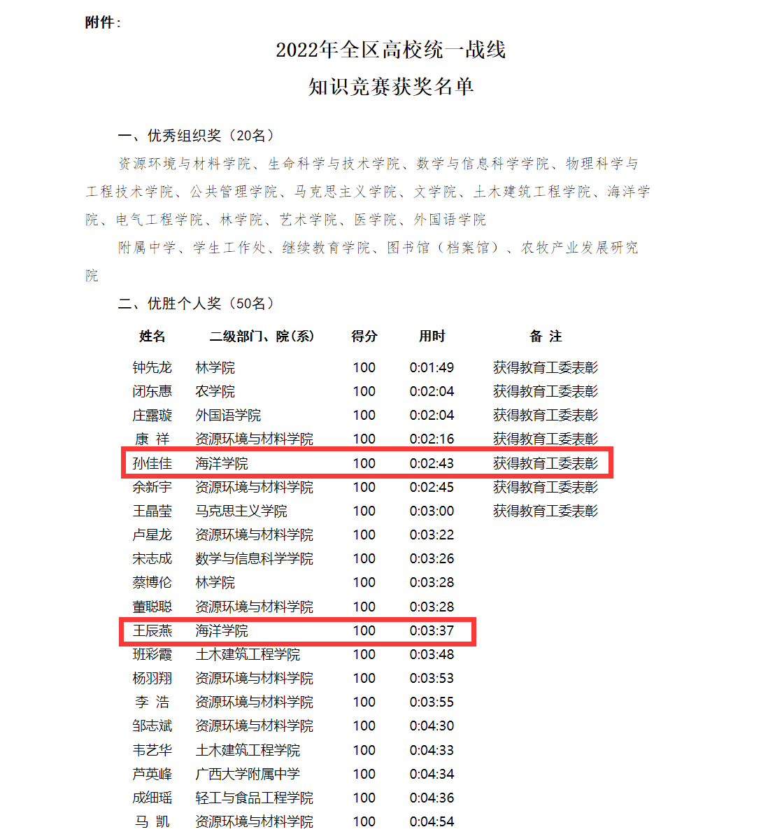 近日,自治区党委教育工委公布了“喜迎党的二十大 奋进新征程”2022年全区高校统一战线知识竞赛结果。我院在答题中组织成效显著、师生成绩优异,荣获优秀组织奖。我院孙佳佳同学、王辰燕同学在大赛中荣获“优胜个人奖”,其中孙佳佳同学为我校获得教育工委表彰的7人之一。