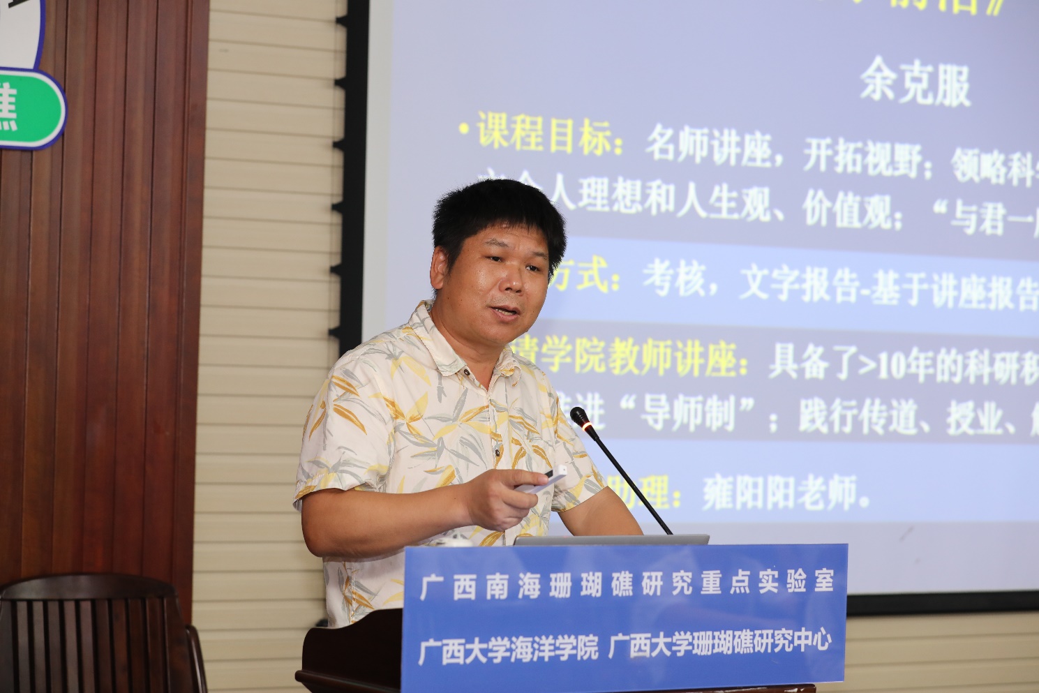 讲座伊始,余克服教授向同学们介绍了“海洋科学前沿”的课程目标、规划以及考试方式。该课程是学院为激发大学生对科学的热情、启迪理性思维、开拓科学视野、领略科学前沿而开设,通过邀请校内外专家、学者作讲座的方式,引导大学生对海洋的认识、激发他们对海洋学科的热情、帮助他们了解并掌握科研的方法。同时通过讲座增加学生对学院教师们的了解,介绍学院倡导的本科生“导师制”的管理机制,并为海洋科学专业的同学们树立人生理想提供思路,强调了开阔视野、拓宽眼界的重要性。