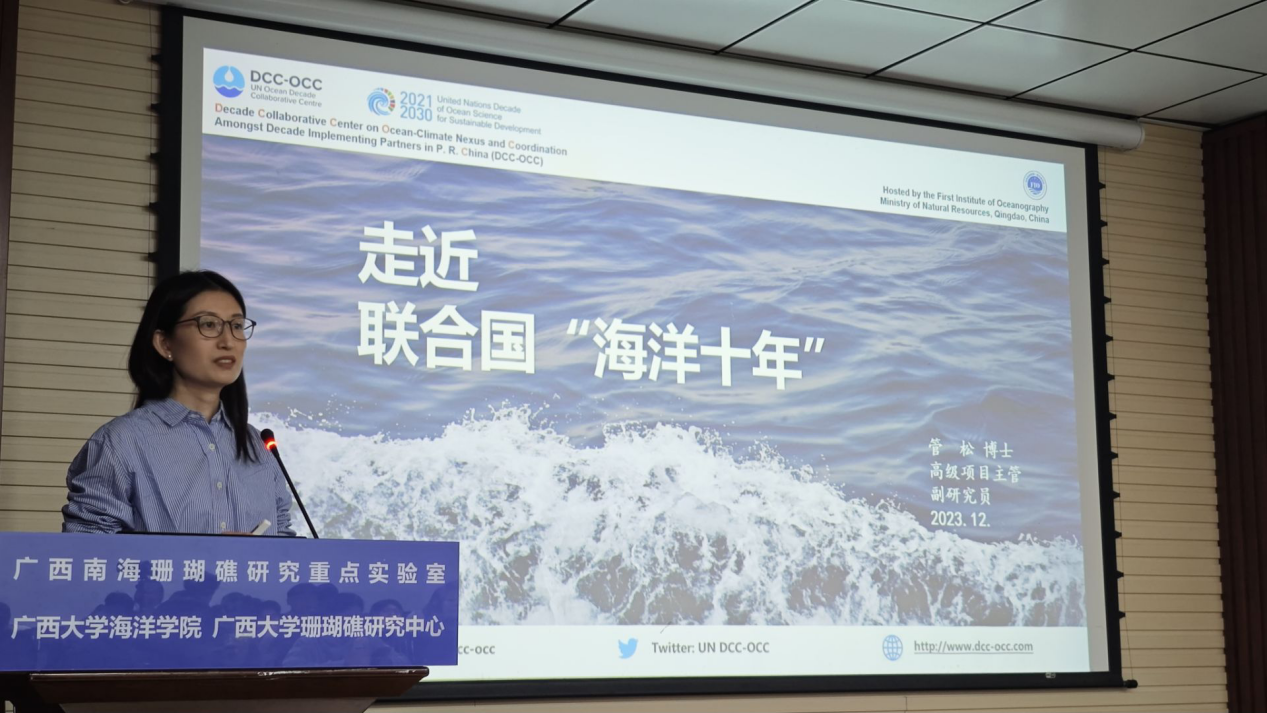 应我院院长余克服教授邀请,自然资源部第一海洋研究所副研究员、法学博士、现任联合国“海洋十年”海洋与气候协作中心高级项目主管管松莅临我院“走进海洋,走进科学”海洋名师讲堂为师生们作了题为《走进联合国“海洋十年”》的学术报告。此次报告旨在深入解读联合国“海洋十年”实施计划,让师生们更深入地了解海洋可持续发展的重要性。我院王瑞副院长主持学术报告会。