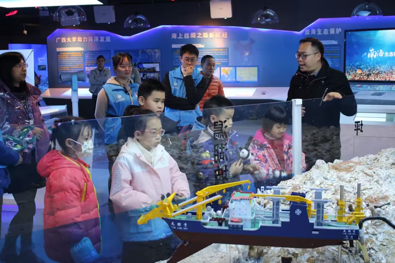 最后,在讲解员的带领下,大家走进了海洋科教馆,依次参观了蔚蓝之境、海洋之魅、研海之行、探海之道、筑梦之基五大板块。他们不仅观赏了各式各样、五彩斑斓的珊瑚标本,还体验了“海底种珊瑚”“深海勇士号下潜”“清理海洋垃圾”等多种新奇刺激的VR游戏,沉浸式探索海底世界的奥秘。