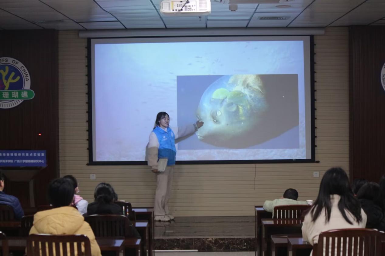 本次活动分为以下四个环节:海洋公益纪录片观影,科普大讲堂,海洋世界探索以及走进海底热带雨林。 活动开始,大家来到综合楼215会议室,观看了海洋公益纪录片,初步了解了深海环境的特点。随后,天堂在线视频最美女人体内射精一区二区“蓝色梦想”科普团为大家开展了以“奇特的深海动物”为主题的科普讲堂。主讲人余莹文形象生动地为大家依次介绍了管眼鱼、蝰鱼、灯笼鱼等深海生物的主要特征和生活习性,现场氛围轻松活跃,大家积极互动交流,收获了不少知识。