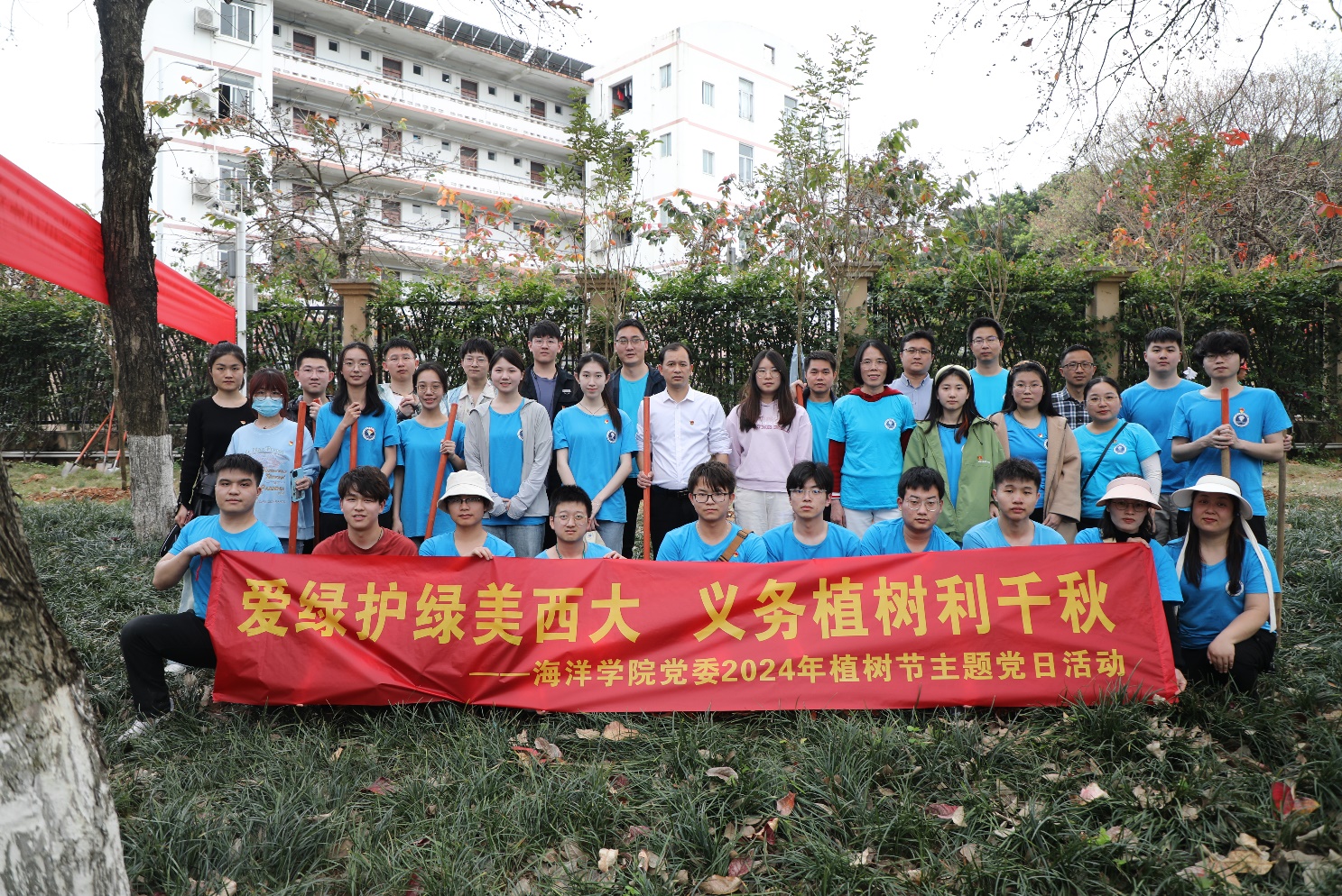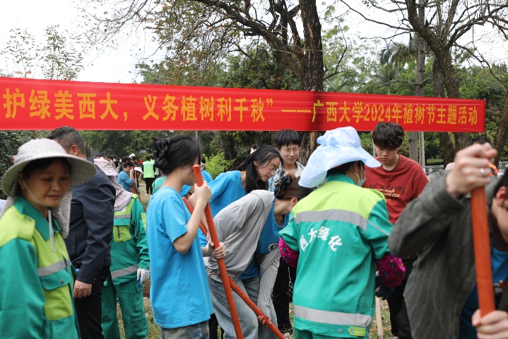 2024年3月12日是第46届国际植树节,为深入贯彻党的二十大精神,践行绿水青山就是金山银山的生态文明建设理念,弘扬植绿、护绿、爱绿的文明新风,加快推进绿色美丽校园建设,学院党委于2024年3月12日联合学校后勤基建处、资源环境与材料工程学院、广西博世科环保科技股份有限公司在学校图书馆西侧绿地开展主题为“爱绿护绿美西大,义务植树利千秋”2024年植树节主题党日活动。此次活动由学校后勤基建处处长余波主持,学校党委常委、副校长宁旭初、刘向参加活动,我院党委书记秦华东率领师生党员共45人参与了活动。