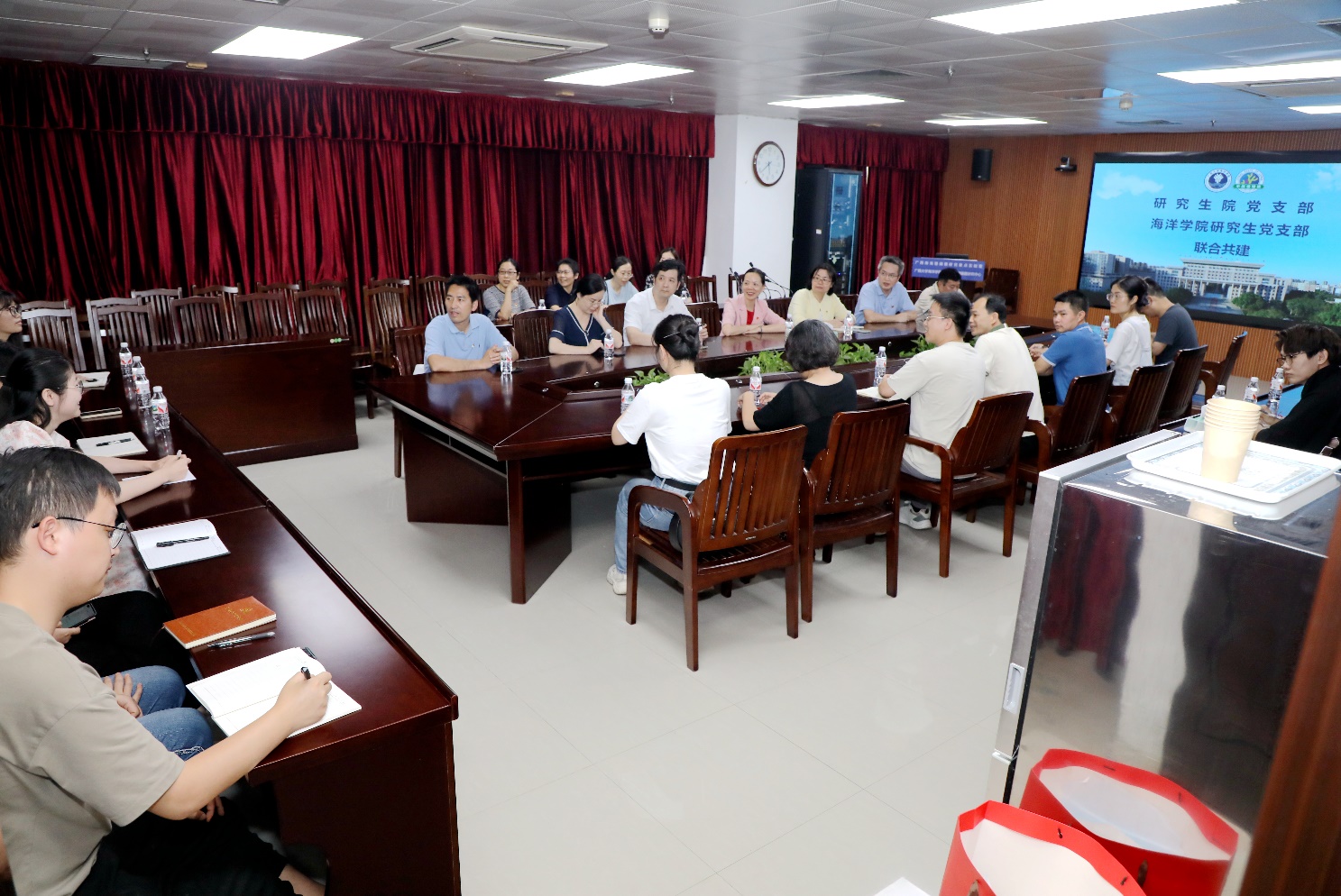 为了加强支部建设,提升研究生的教育质量。4月16日,天堂在线视频研究生院党支部与最美女人体内射精一区二区全体研究生党支部在综合楼联合开展了“携手共进,共创辉煌”为主题联建活动,旨在通过党支部间的交流研讨,解决学院研究生人才培养和党员教育问题,提升党员的凝聚力和战斗力。此次活动由学院党委书记秦华东主持,研究生院院长刘小玲、海洋学院副院长梁甲元出席会议,双方师生党员代表共21人参加。