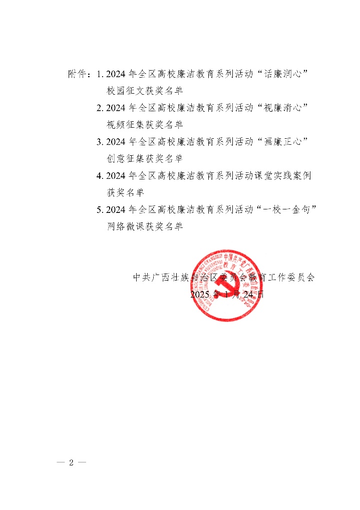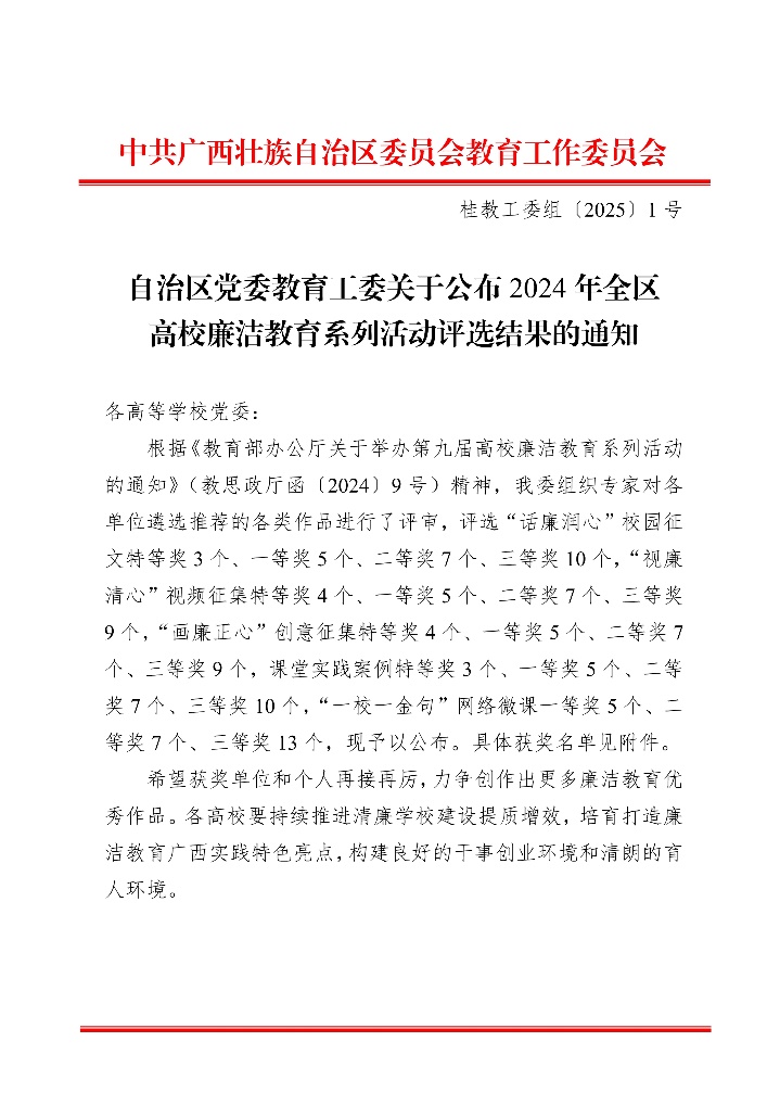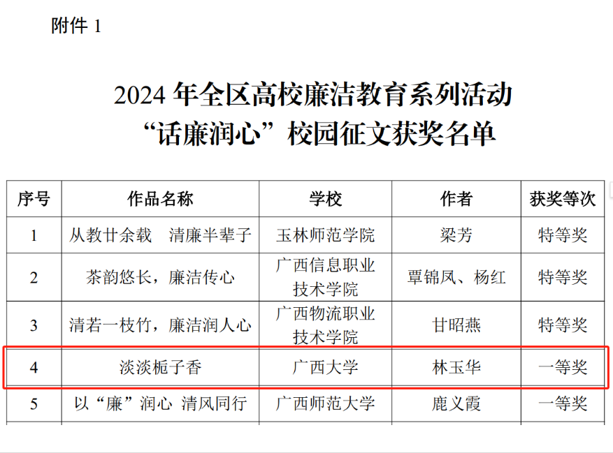 近日,自治区党委教育工委公布了2024年全区高校廉洁教育系列活动评选结果,我院林玉华老师的作品《淡淡栀子香》荣获2024 年全区高校廉洁教育系列活动“话廉润心”校园征文一等奖。 学院党委对本次活动高度重视,积极组织推荐林玉华老师的作品《淡淡栀子香》。经校内初审后,推送到全区参加评选,最终荣获一等奖。这是我校在本次系列活动的征文比赛项目中获得的唯一一项一等奖。 文字作者:周剑 编辑:周剑 一审一校:林玉华 二审二校:刘旗扬 三审三校:黄学勇