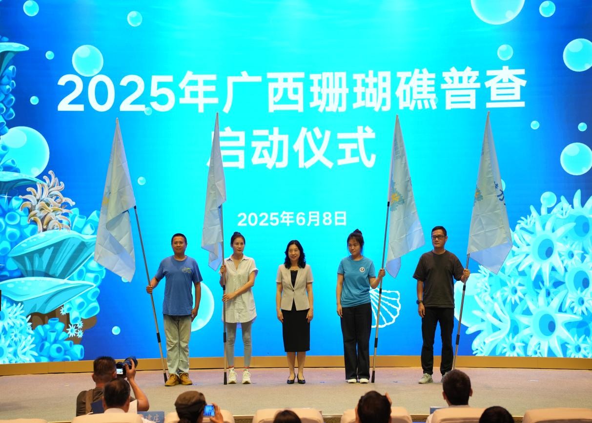 活动中,黎宁为广西珊瑚礁普查志愿服务队授旗,正式启动2025年“广西珊瑚礁普查行动”。