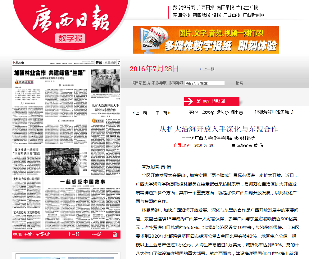 林昆勇说,加快广西沿海开放发展、深化与东盟的合作是广西开放发展中的重要问题。东盟已连续15年成为广西第一大贸易伙伴,去年广西与东盟贸易额接近300亿美元,占外贸进出口总额的56.6%。北部湾经济区设立10年来,经济增长很快。自治区要求到2020年北部湾经济区四市经济总量占全区比重突破40%,地区生产总值、规模以上工业总产值过1万亿元,人均生产总值过1万美元,城镇化率达到60%。党的十八大作出了建设海洋强国的重大部署。就广西而言,建设海洋强国和21世纪海上丝绸之路,就是要推动广西由加快建设海洋经济强区向全力打造海洋经济强区跨越,确保到2020年与全国同步全面建成小康社会,基本建成面向东盟的国际大通道、西南中南地区开放发展新的战略支点、21世纪海上丝绸之路与丝绸之路经济带有机衔接的重要门户。