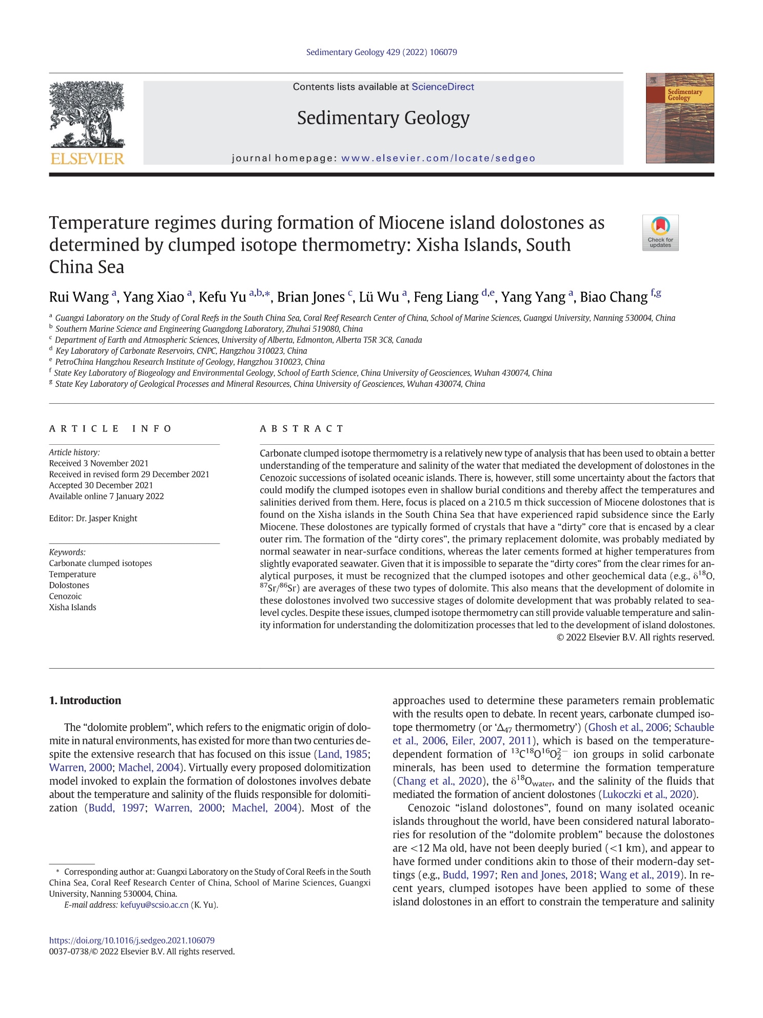 论文信息如下:Wang Rui, Xiao Yang, Yu Kefu , Brian Jones, Wu Lü, Liang Feng , Yang Yang, Chang Biao, 2022. Temperature regimes during formation of Miocene island dolostones as determined by clumped isotope thermometry: Xisha Islands, South China Sea. Sedimentary Geology, 429: 106079. https://doi.org/10.1016/j.sedgeo.2021.106079.