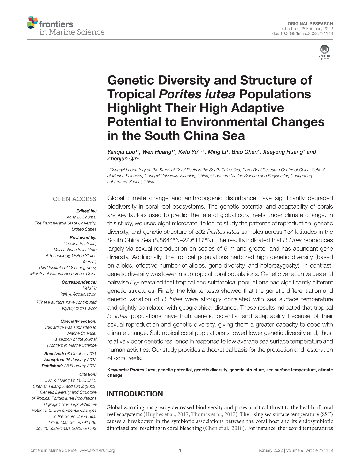 我院硕士研究生罗燕秋与黄雯博士为共同一作的研究论文“Genetic Diversity and Structure of Tropical Porites lutea Populations Highlight Their High Adaptive Potential to Environmental Changes in the South China Sea”,近日发表于Fronties in Marine Science(中国科学院二区,IF:4.912)。