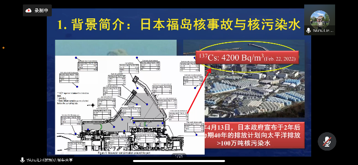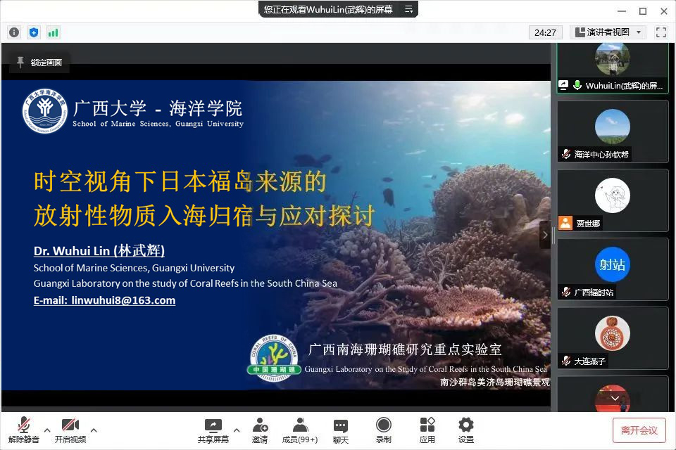 林武辉副院长是我国首批参加日本福岛核事故后西太平洋放射性调查人员之一,多年来专注于海洋放射性核素测量与海洋过程示踪、滨海核电站的海洋放射性观测与评价,主持海洋放射性核素研究领域的多项国家级和省部级项目,多次受邀参加国际原子能机构的相关会议,曾参加我国海洋环境放射性核素监测技术规程的编制工作,已经围绕海洋中210Po、210Pb、234Th、238U、226Ra、228Ra、228Th、232Th、40K、90Sr等多种天然和人工放射性核素开展较为系统的工作[1-5],并长期追踪日本福岛核事故和核污染水的前沿进展[6-8],目前也围绕南海珊瑚岛礁放射性核素研究开展相关探索工作[5,9-10]。(林武辉/文 会议截屏/图 周剑/编辑 余克服/审核)