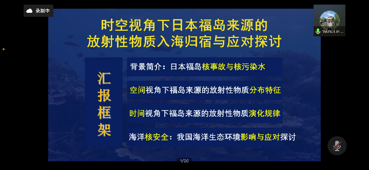 在世界地球日(4月22日上午)的特殊时刻,林武辉副院长应国家海洋环境监测中心邀请参加海洋生态环境监测与保护学术报告(线上报告),为国家海洋环境监测中心以及相关科研院所的近200名专家和学者带来题为《时空视角下日本福岛来源的放射性物质入海归宿与应用探讨》的学术讲座,国家环境保护近岸海域生态环境重点实验室副主任姚子伟研究员主持学术讲座,国家海洋环境监测中心政策规划与科技发展处孙钦帮处长出席会议。
