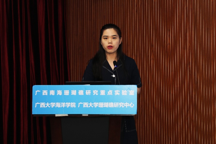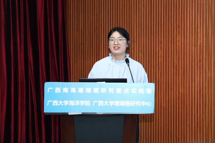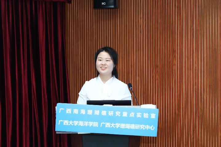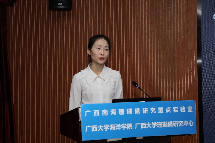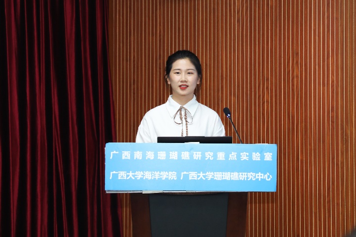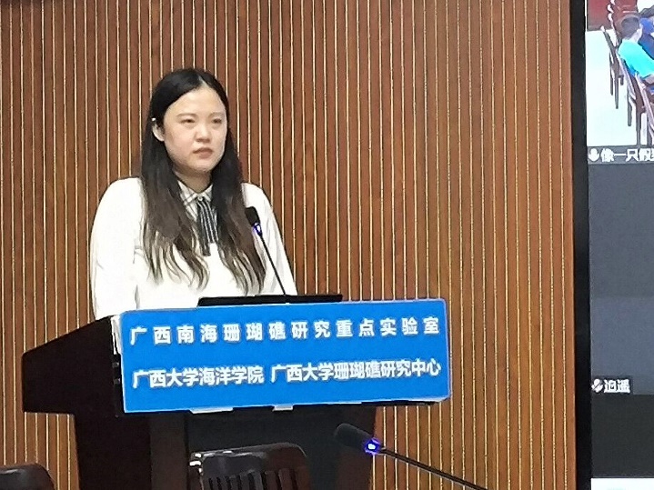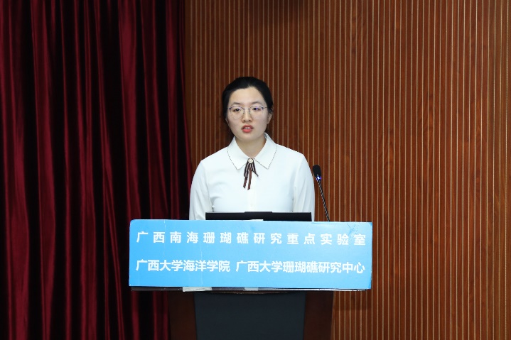 张晶晶同学(导师:裴继影博士)主要对涠洲岛十字牡丹珊瑚高温胁迫前后的代谢物变化进行了相关研究,其论文题目是《基于质谱代谢组学探究珊瑚对高温胁迫的代谢应答机制》。张晶晶同学本科毕业于安徽科技学院生命科学学院,于2018年9月至本校就读研究生,主要研究方向为生物分析化学。读研期间,担任班级团支书职务,并参与广西自然科学基金面上项目:基于代谢组学的珊瑚共生体制响应高温胁迫的生化机制。