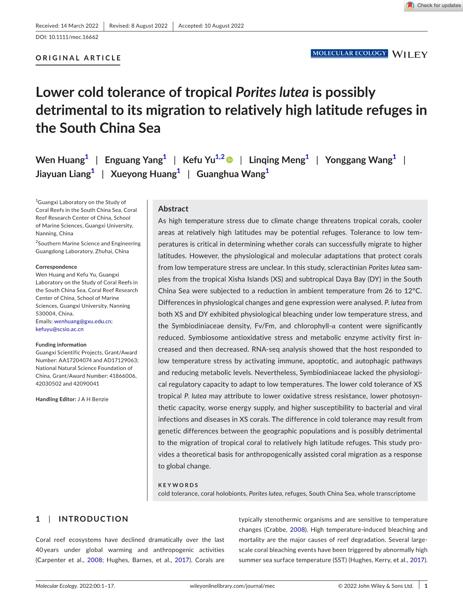 Huang Wen, Yang Enguang, Yu Kefu, Meng Linqing, Wang Yonggang, Liang Jiayuan, Huang Xueyong, Wang Guanghua. 2022. Lower cold tolerance of tropical Porites lutea is possibly detrimental to its migration to relatively high latitude refuges in the South China Sea. Molecular Ecology, 00, 1–17. https://doi.org/10.1111/ mec.16662.
