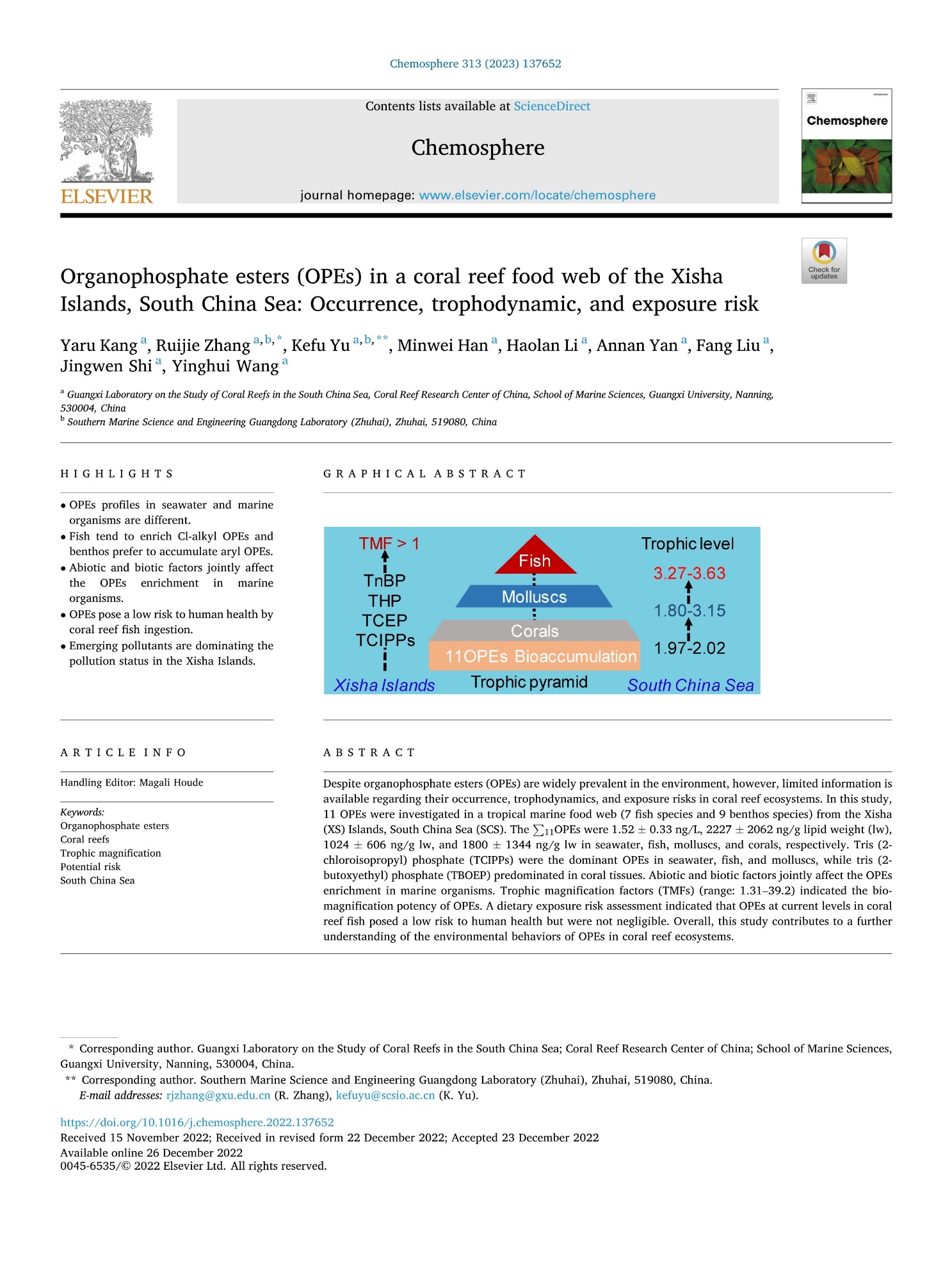 Kang Yaru, Zhang Ruijie, Yu Kefu, Han Minwei, Li Haolan, Yan Annan, Liu Fang, Shi Jingwen, Wang Yinghui. Organophosphate esters (OPEs) in a coral reef food web of the Xisha Islands, South China Sea: occurrence, trophodynamic, and exposure risk. Chemosphere, 2023. 313: 137652. https://doi.org/10.1016/j.chemosphere.2022.137652.