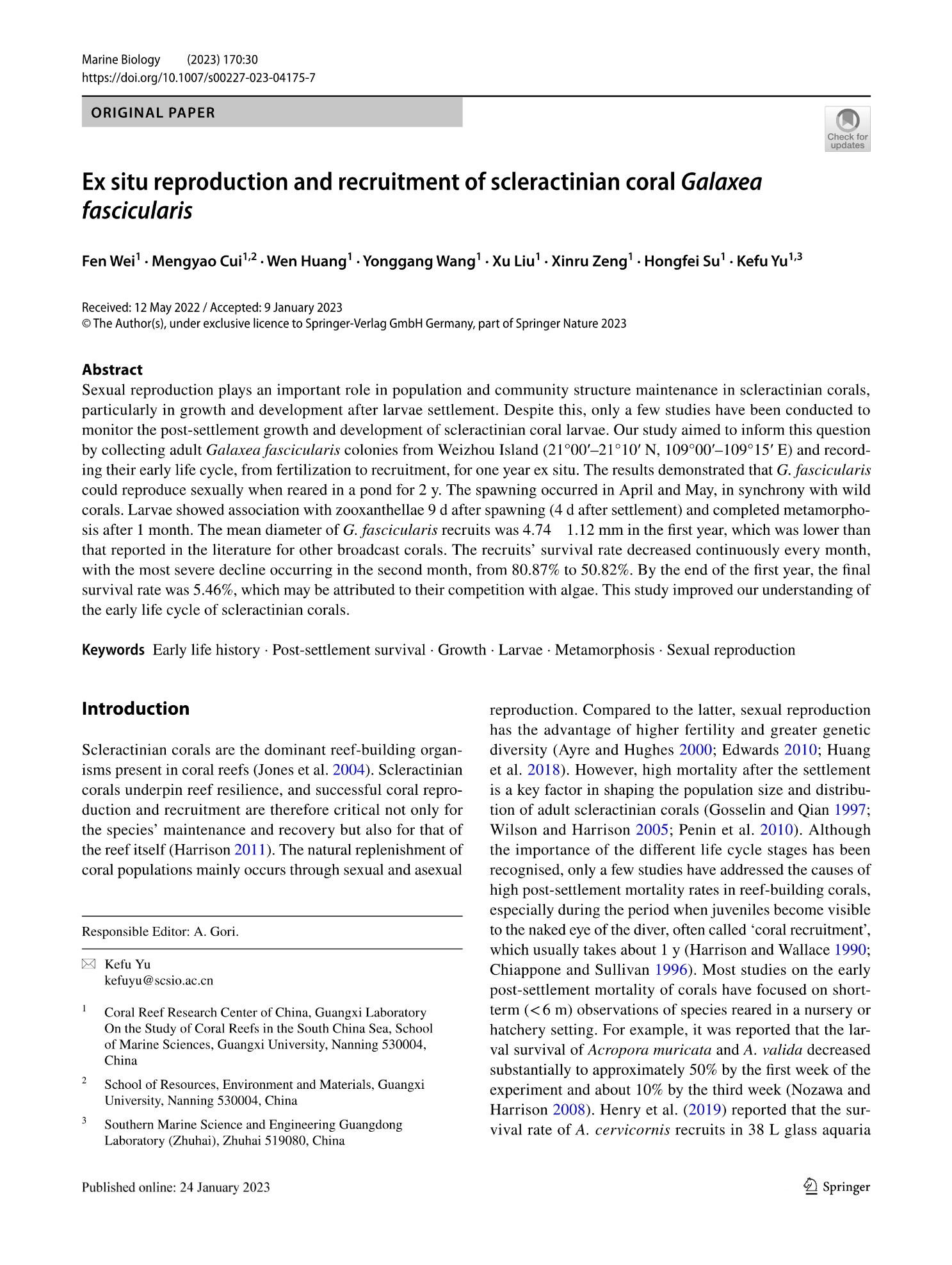 Wei F., Cui M., Huang W., Wang Y., Liu X., Zeng X., Su H., Yu K. Ex situreproduction and recruitment of scleractinian coral Galaxea fascicularis. Marine Biology, 2023, 170(3): 30. https://doi.org/10.1007/s00227-023-04175-7