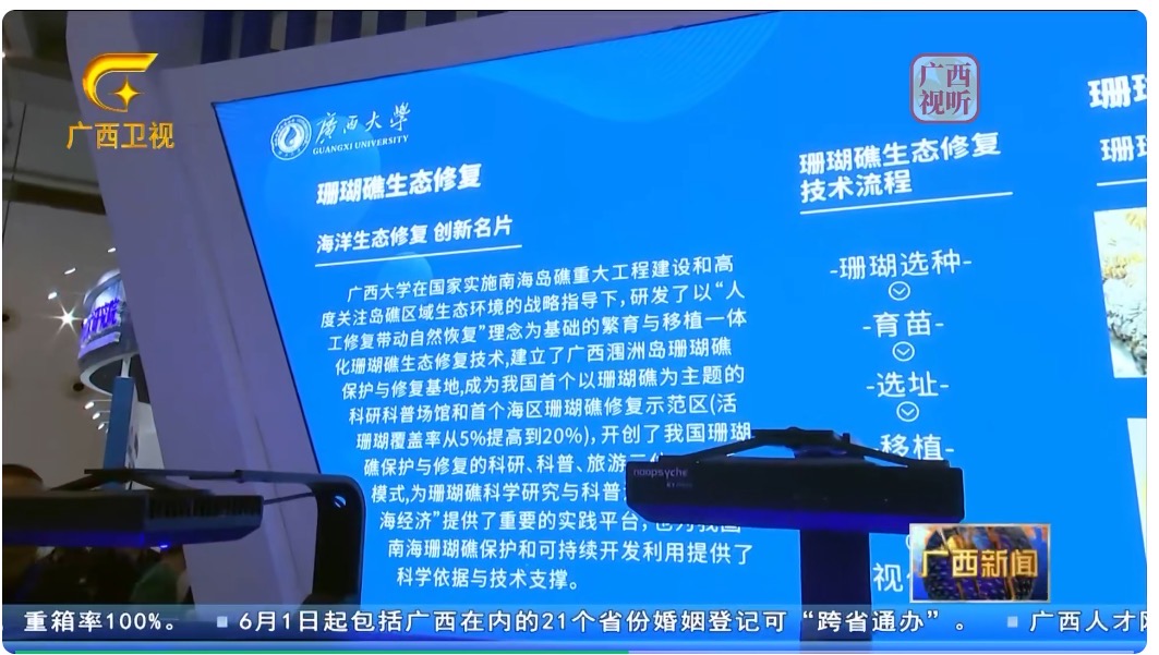 5月20日、21日,由自治区人民政府主办,自治区科技厅、自治区科技创新发展办公室共同承办的2023年全国科技活动周广西活动暨第三十二届广西科技活动周•广西先进技术展示活动(简称“两周一展”)在南宁国际会展中心举行。我院“珊瑚礁生态修复技术”作为天堂在线视频先进技术展示内容的一部分亮相展览会。