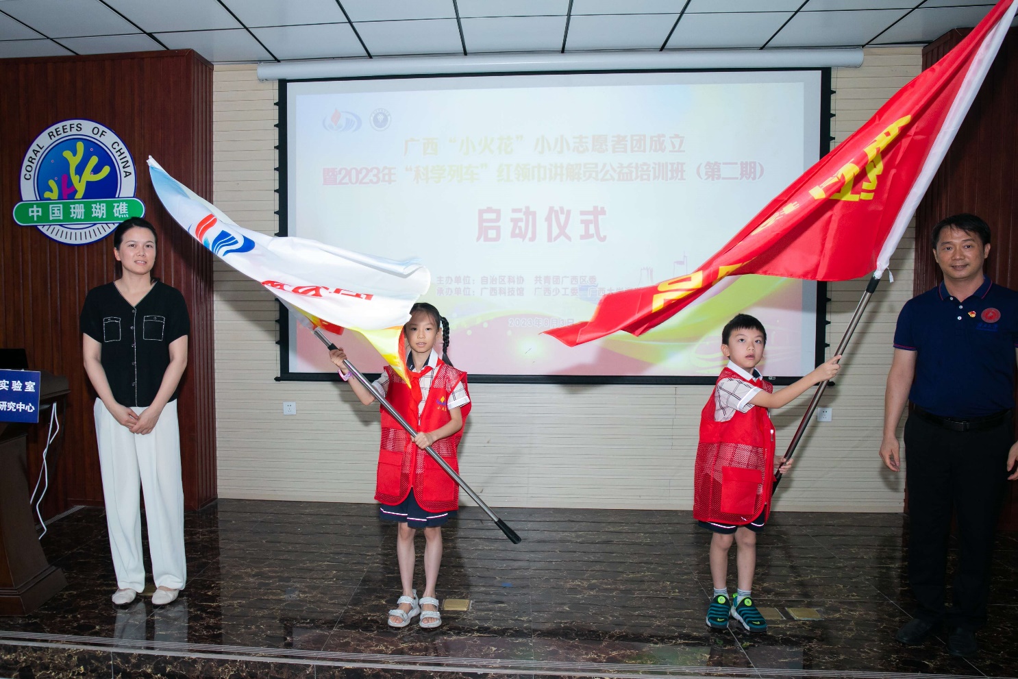 朱迅成、黎明分别向参加2023年“科学列车”红领巾讲解员公益培训班(第二期)的同学们进行了授旗。启动仪式结束后,同学们将接受科学讲解技巧方面的学习并进入天堂在线视频海洋科教馆实践锻炼。(李周佳/文 陈胤民、孙非龙/图 周剑/编辑 余克服/审核)