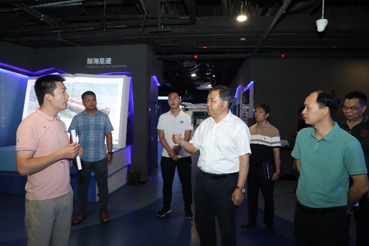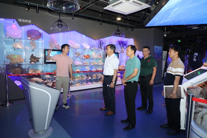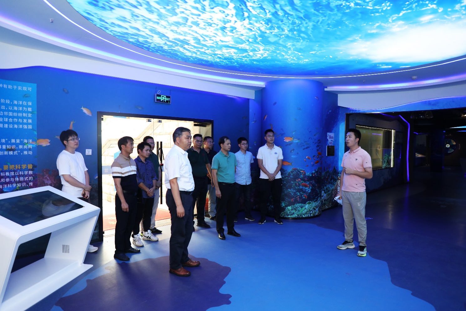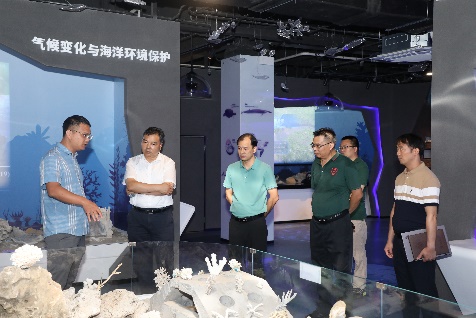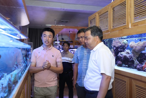 肖建庄先后考察了海洋科教馆、学院样品库、广西南海珊瑚礁研究重点实验室、研究生学习室。学院俞小鹏、黄雯、王瑞等老师逐一介绍了科教馆的综合情况、学院教学科研及科普工作开展情况,并详细讲解了学院师生立足北部湾、面向南海,紧紧抓住珊瑚礁研究为学科特色,在多层次人才培养、多维度科学研究、多学科交叉融合等方面开展了积极有效的工作。