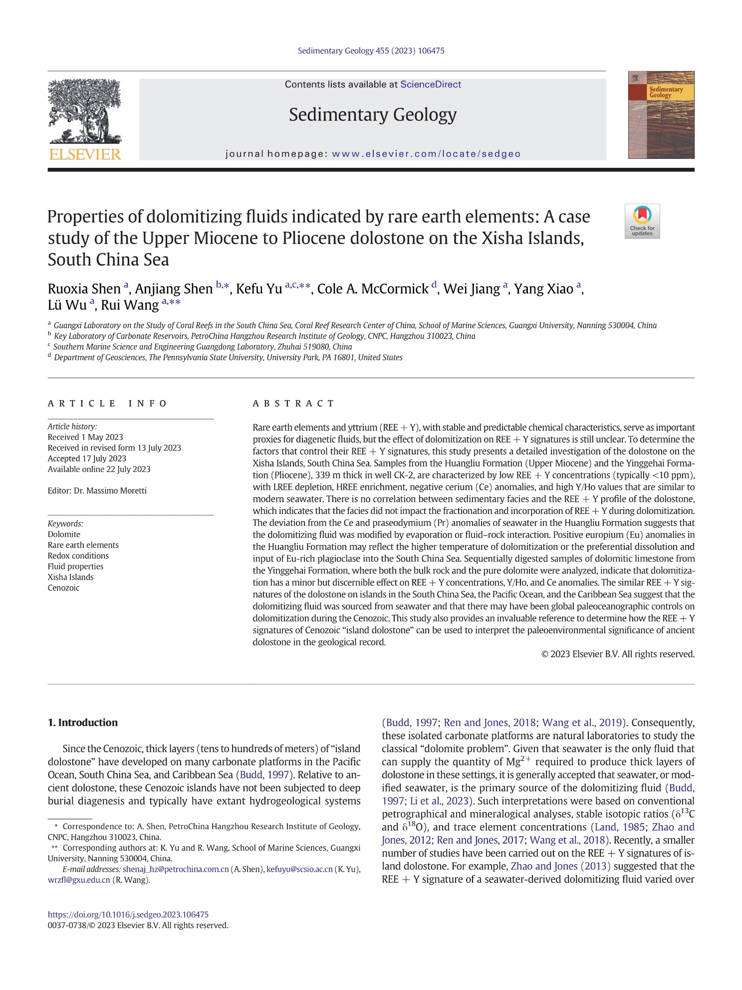 近日,在我院王瑞副教授等的指导下,硕士研究生沈若夏以第一作者在国际沉积学经典期刊Sedimentary Geology上发表论文“Properties of dolomitizing fluids indicated by rare earth elements: A case study of the Upper Miocene to Pliocene dolostone on the Xisha Islands, South China Sea”。该论文系统评估了西沙群岛白云石化作用对稀土元素的影响,为岛礁“白云岩问题”研究提供了新的线索。