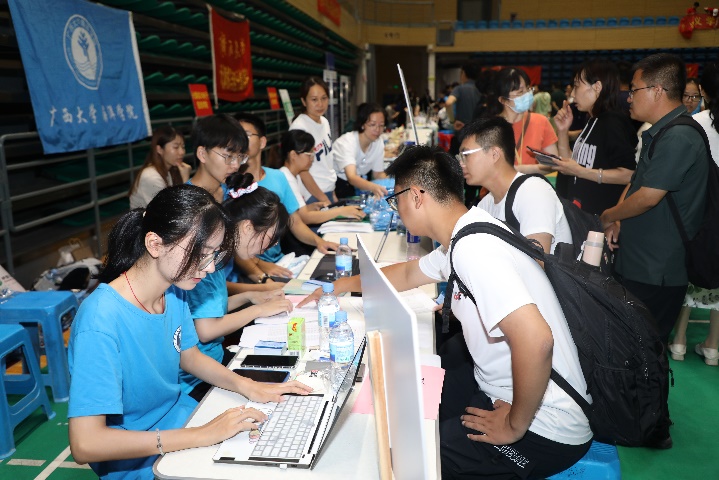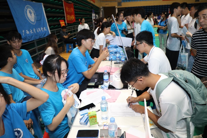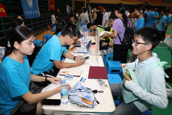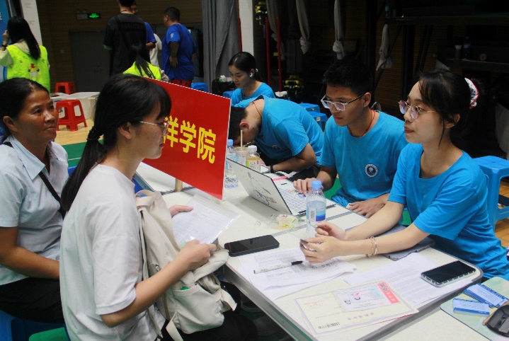 9月9日上午迎新系统刚开放,新生们陆续迈进学校,在一对一接待服务的志愿者以及班助的协助下完成材料验证、办理校园卡等报到手续。学院党委书记秦华东、党委副书记朱迅成到场指导迎新工作、与新生家长等进行交谈,并亲切慰问新生和迎新工作师生及志愿者。团委学工、研究生办公室和行政办等相关负责老师也到场协助迎新工作的开展。