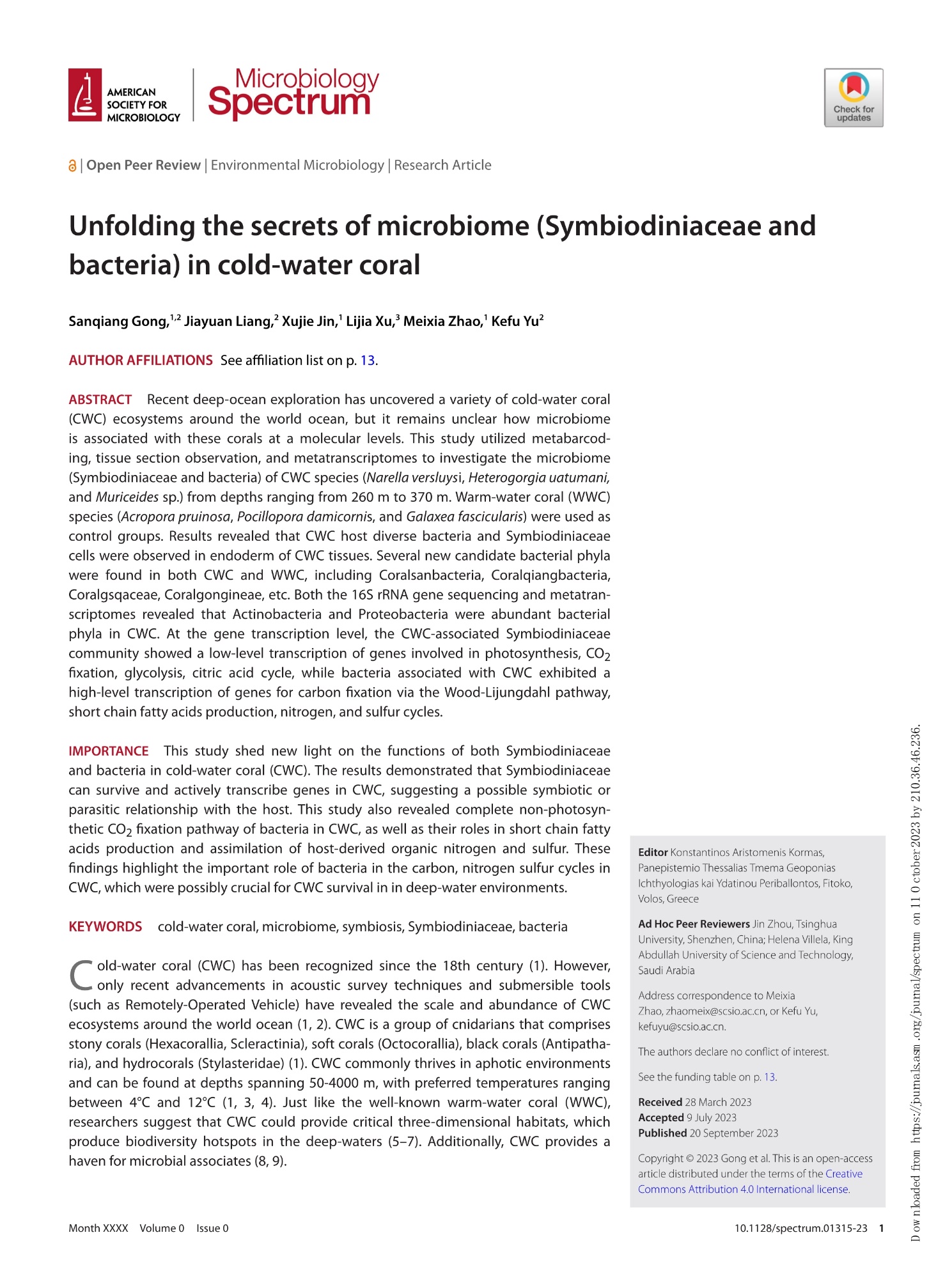 近日,广西南海珊瑚礁研究重点实验室客座研究员巩三强(中国科学院南海海洋研究所博士)为首在中国科学院一区Top期刊Microbiology Spectrum发表了题为 “Unfolding the secrets of microbiome (Symbiodiniaceae and bacteria) in cold-water coral”的研究论文。该研究结合细菌16S及藻类ITS2 barcodes高通量扩增测序、宏转录组测序及组织切片观察等技术, 首次在冷水珊瑚中确证了具有细胞活性的虫黄藻类群(Cladocopium 和Durusdinium)的存在,并在基因转录水平重构了完整的冷水珊瑚中虫黄藻的关键代谢途径, 包括光合碳固定等。 该研究初步界定了几个丰度较高的细菌新类群, 其中包括2个潜在的细菌新门:命名为珊瑚三(Coralsanbacteria)和珊瑚强(Coralqiangbacteria)细菌门,其中Coralsanbacteria可能是光合细菌蓝藻的祖先类群,并在基因转录水平重构了完整的冷水珊瑚中细菌的关键代谢途径,包括古老的非光合CO2 固定通路(the Wood-Lijungdahl pathway),硫循环通路(inorganic sulfur assimilation and organic sulfur disassimilation pathways),短链脂肪酸合成通路(short chain fatty acids synthesis pathways for acetate, butyrate, and propionate)等。