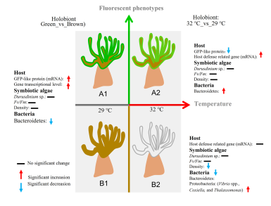 2020年发表在《Current Biology》期刊上的一篇野外观察性研究论文揭示珊瑚颜色表型变化伴随珊瑚白化过程, 这种颜色表型的变化与珊瑚排藻白化过程中珊瑚对光的吸收有关, 是珊瑚适应环境胁迫的一种表现。为了进一步验证该理论, 研究团队在我国南海海域采集了同一种具有不同表型的丛生盔形珊瑚,并以其为研究对象分析了这2种不同表型的珊瑚对热胁迫的响应。 研究发现呈现绿色表型的珊瑚个体相对呈现棕色表型的珊瑚个体具有较高的热白化耐受性。进一步通过共生微生物组成和基因转录水平变化分析发现, 呈现绿色表型的珊瑚个体具有较高的绿色荧光蛋白、氧化磷酸化、细胞生长与死亡相关基因转录水平及较低的病原细菌丰度。