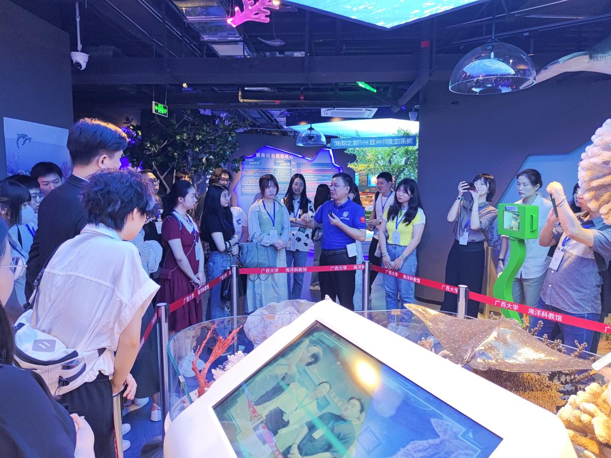 6月13日上午,由香港教育大学高级讲师、香港历史文化研究会会长、香港青少年教育发展联会创会主席、参访团团长叶德平率领的香港青少年教育发展联会参访团在自治区党委统战部部务委员、广西海外联谊会副会长覃定坚,共青团广西区委常委、二级巡视员刘宇红,自治区政府驻广州办党组成员、副主任伍金荣一行的陪同下到我院海洋科教馆参观交流。校党委副书记马献力、学院副院长刘旗扬陪同参观。