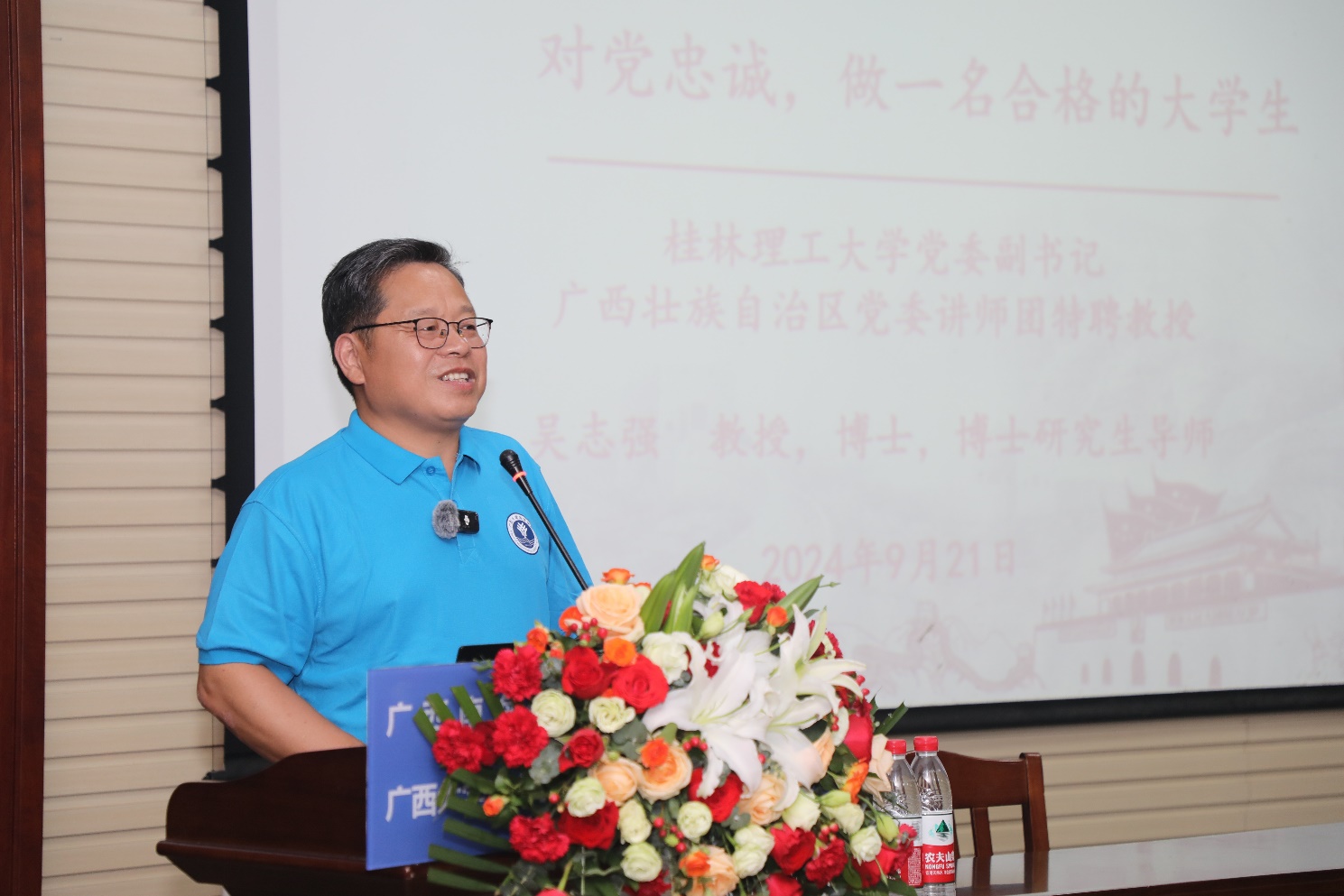 9月21日,在学院喜迎10周年院庆之际,桂林理工大学党委副书记、我院客座教授吴志强教授以《对党忠诚,做一名合格的大学生》为题在215会议室为2024级本科新生带来了一场别开生面的新生入学教育讲座。学院院长余克服教授、院长助理黄荣永副教授出席讲座。学院党委副书记黄学勇主持讲座。