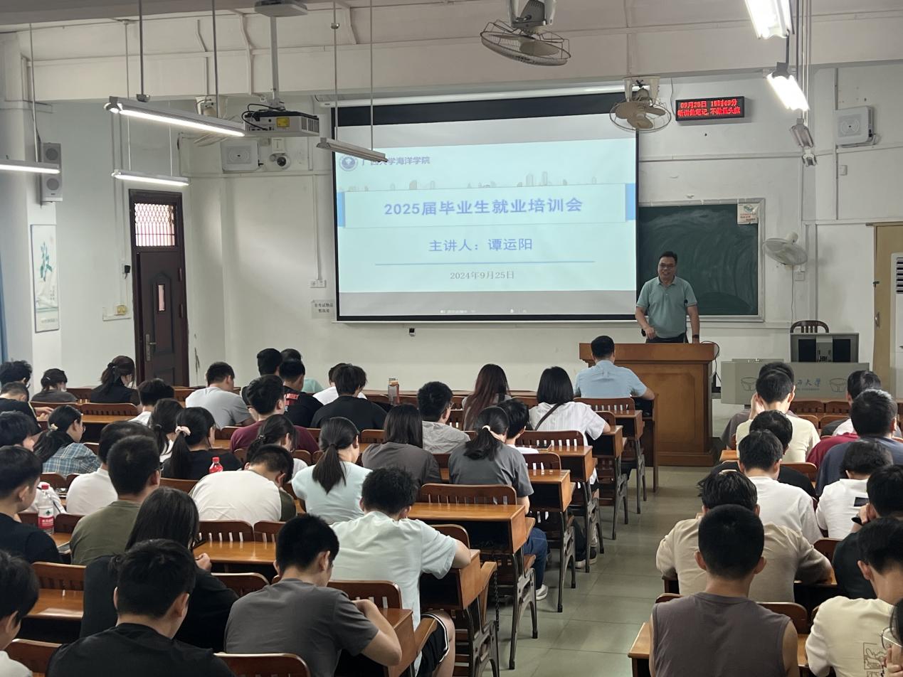 随后,学院原党委书记、职业规划与就业创业指导专家谭运阳老师为毕业生们带来了精彩的就业培训指导。谭老师以其丰富的经验和深厚的专业知识,围绕“锚定目标、做好冲刺”、“梳理信息、完善简历”、“收集信息、把握机会”以及“准备充分、做好面试”四个方面,为毕业生们提供了全面而实用的建议。他通过生动的案例和具体的操作方法,帮助学生们更好地理解了求职过程中的各个环节,并传授了诸多实用的求职技巧和方法。