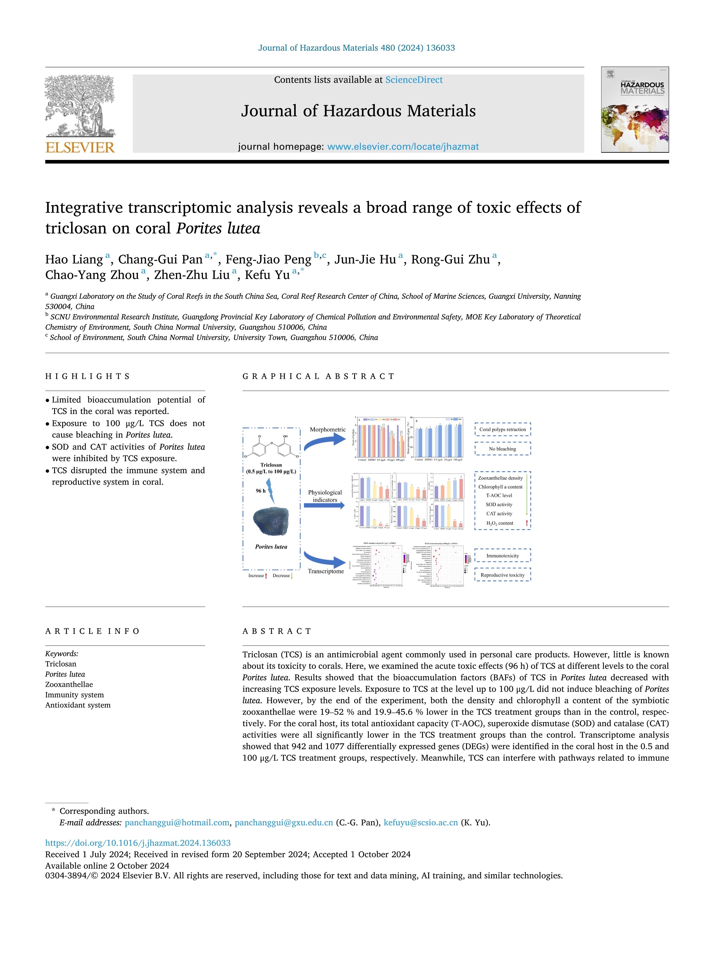 Liang Hao, Pan Changgui, Peng Fengjiao, Hu Junjie, Zhu Ronggui, Zhou Chaoyang, Liu Zhenzhu and Yu Kefu. 2024. Integrative transcriptomic analysis reveals a broad range of toxic effects of triclosan on coral Porites lutea. Journal of Hazardous Materials. 480, 136033. https://doi.org/10.1016/j.jhazmat.2024.136033.