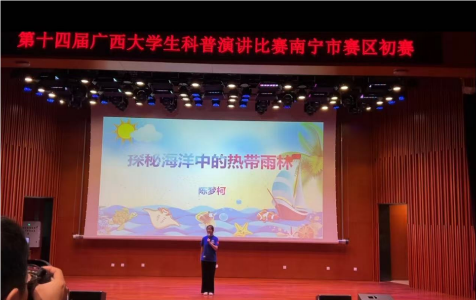 本次比赛吸引了来自驻邕各高校共63名选手报名参赛,选手们围绕“科技引领发展,创新决胜未来”的主题,展开了精彩纷呈的演讲。经过激烈的角逐,共决出一等奖4名、二等奖8名、三等奖16名以及优秀奖31名。我院学子陈梦柯的演讲题目为《探秘海洋中的热带雨林》,她用精彩的演讲向观众展示了珊瑚礁的奥秘以及保护海洋生态环境的紧迫性,赢得了评委和观众的一致好评。最终陈梦柯同学获得了南宁市赛区三等奖,为学院赢得了荣誉。