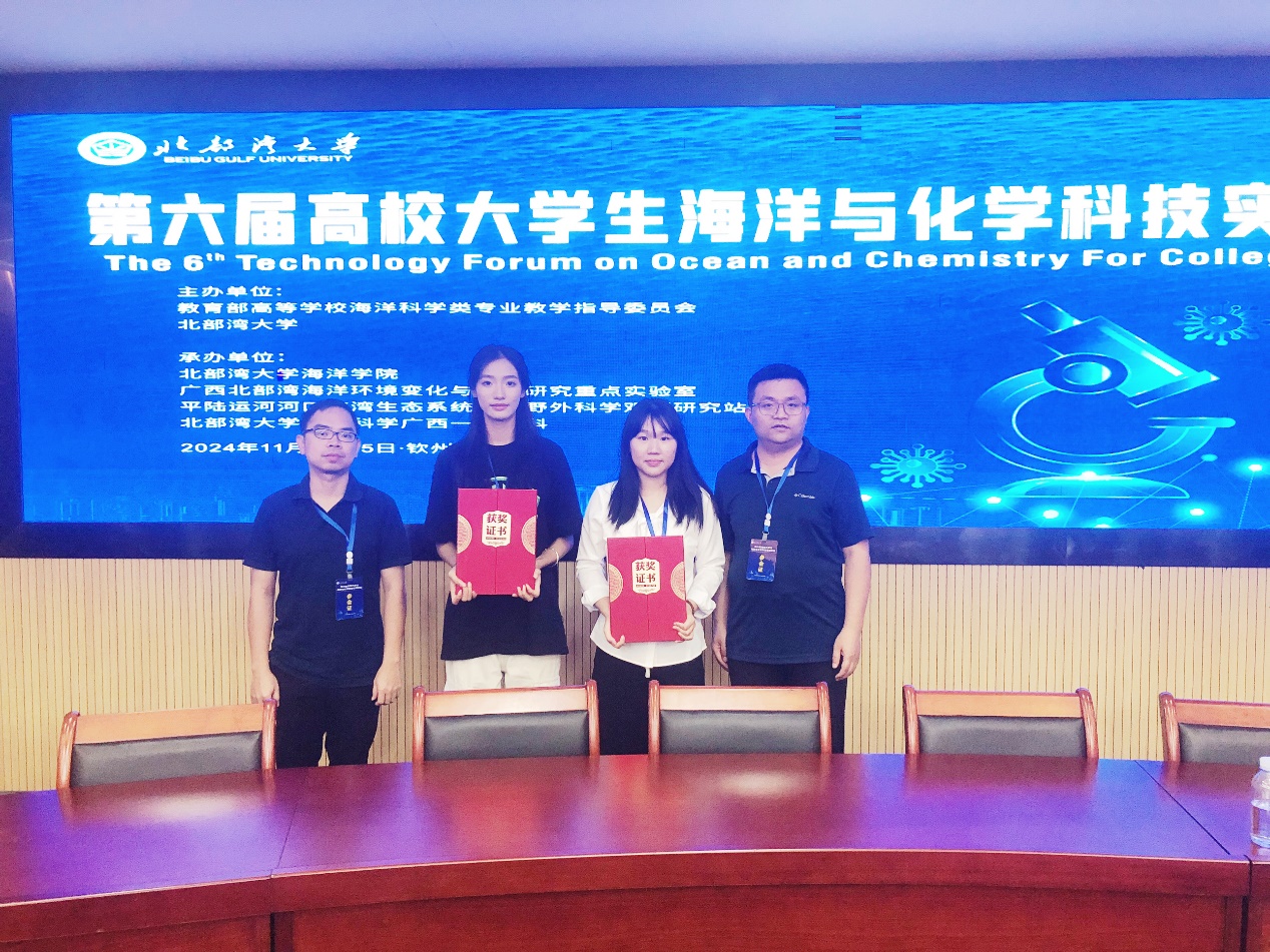 11月14-15日,第六届高校大学生海洋与化学科技实践论坛在北部湾大学举行。我院学术带头人徐向荣教授受邀出席并做大会唯一的前沿讲座“海洋环境中新型替代阻燃剂的生态效应及研究挑战”。2022级海洋科学专业本科学生张佳宇、陈美琪分别作口头报告“基于单细胞组学研究珊瑚共生虫黄藻的化学多样性”“涠洲岛海域有机紫外吸收剂的污染特征及生态风险:来自旅游活动的影响”。2022级海洋科学专业本科生张朔作展板报告“高温实验模拟Mg/Ca浓度对珊瑚块体白云石化过程的影响”。其中,两项口头报告分别荣获一等奖和二等奖。