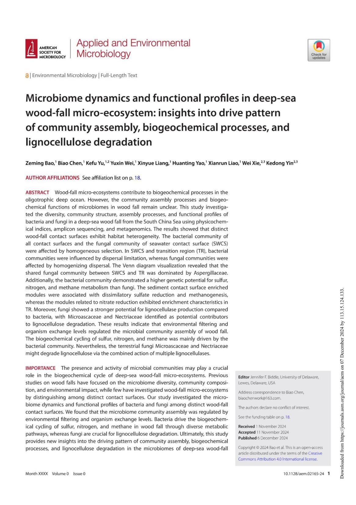 近日,我院陈飚老师指导、硕士研究生包泽铭为第一作者在美国微生物学会旗下权威期刊Applied and Environmental Microbiology(中国科学院二区Top)上发表研究论文“Microbiome dynamics and functional profiles in deep-sea wood-fall micro-ecosystem: insights into drive pattern of community assembly, biogeochemical processes and lignocellulose degradation”