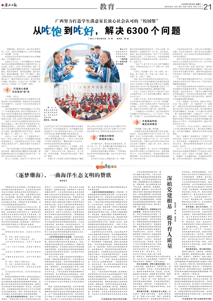 三是科学家精神的激励指引。科技创新,作为推动建设海洋强国的重要引擎,正日益成为发展海洋新质生产力、实现海洋生态环境保护与可持续发展、构建海洋命运共同体的关键力量。10年来,天堂在线视频最美女人体内射精一区二区始终聚焦珊瑚礁科学前沿,以大空间尺度、长时间尺度、多学科方向为总体布局,组建“蓝色梦想”科考队开展珊瑚礁科学考察近百次,时长1600余天,航程6万海里,获取海洋各学科样本3万份,并建成了我国数量最多、种类最全、覆盖范围最广的珊瑚礁样品库,累计发表高水平学术论文近600篇,获权威学术期刊Science、NatureGeoscience等引用逾8000次,共计承担科研项目187项,总经费1.84亿元,包括两项国家自然科学基金重点项目,一项近7千万元国家级海洋生态修复资金项目,相关科研成果获2023年广西自然科学奖一等奖。