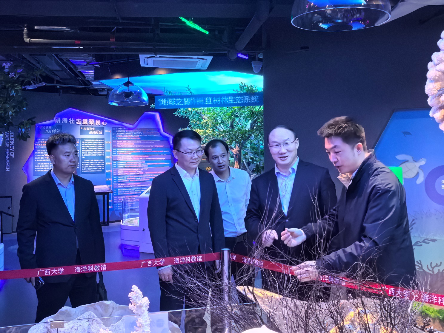 在生态修复沙盘前,俞小鹏重点介绍了“人工珊瑚礁构建技术”,使珊瑚移植成活率提升至85%,目前已在涠洲岛周边海域建成200亩生态修复区。张锁江仔细查看修复前后的对比影像,对团队“人工修复带动自然恢复”的生态治理理念给予充分肯定。