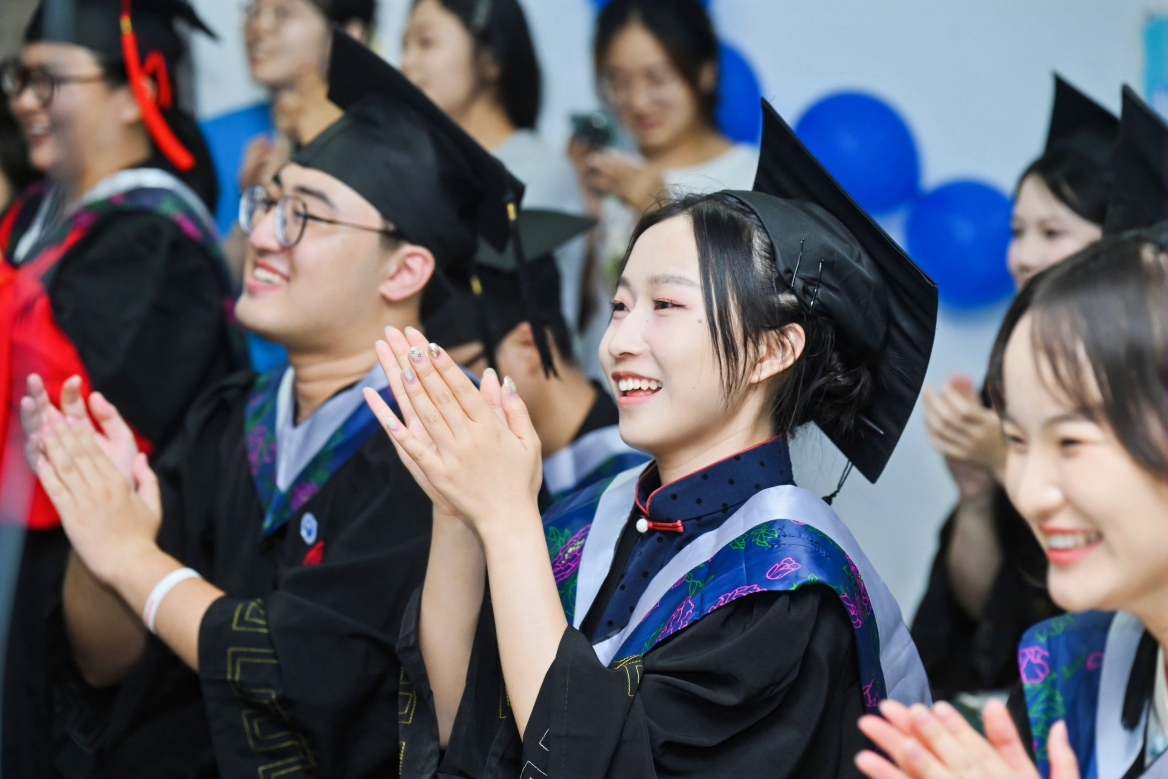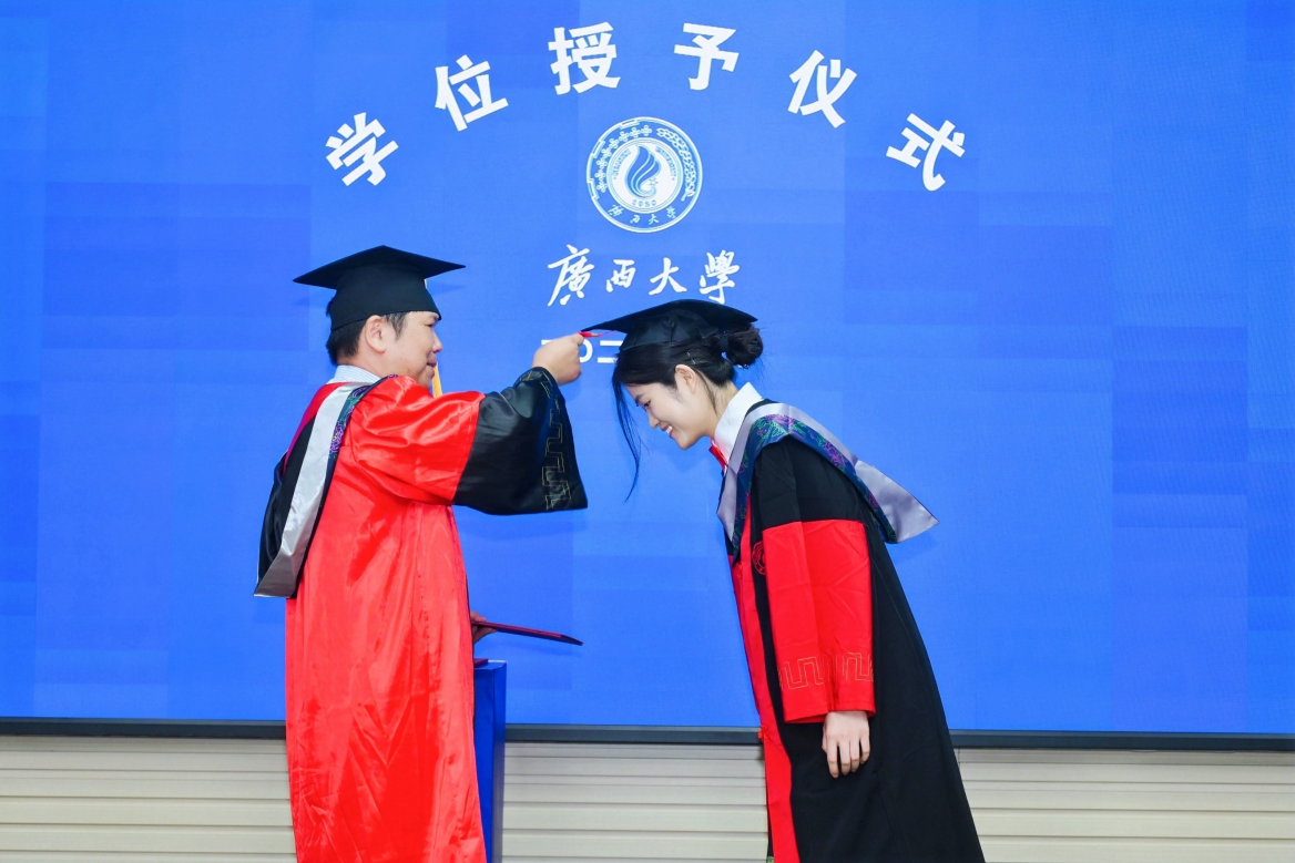 在最激动人心的学位授予环节,余克服院长逐一给毕业生进行拨穗礼、授予学位、颁发学位证书,并合影留念。
