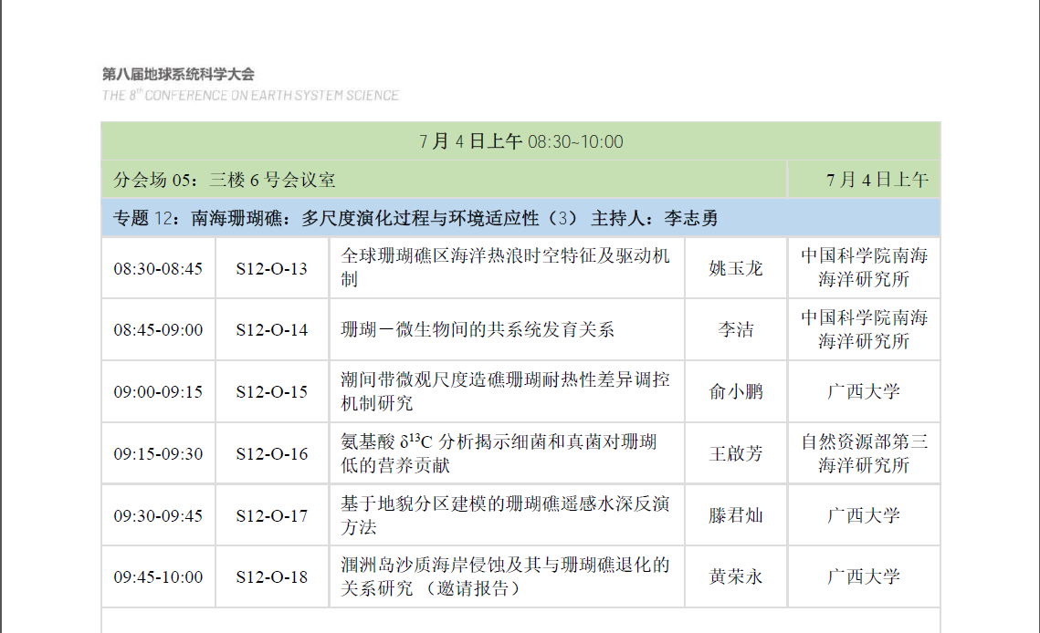 “南海珊瑚礁”专题口头报告日程