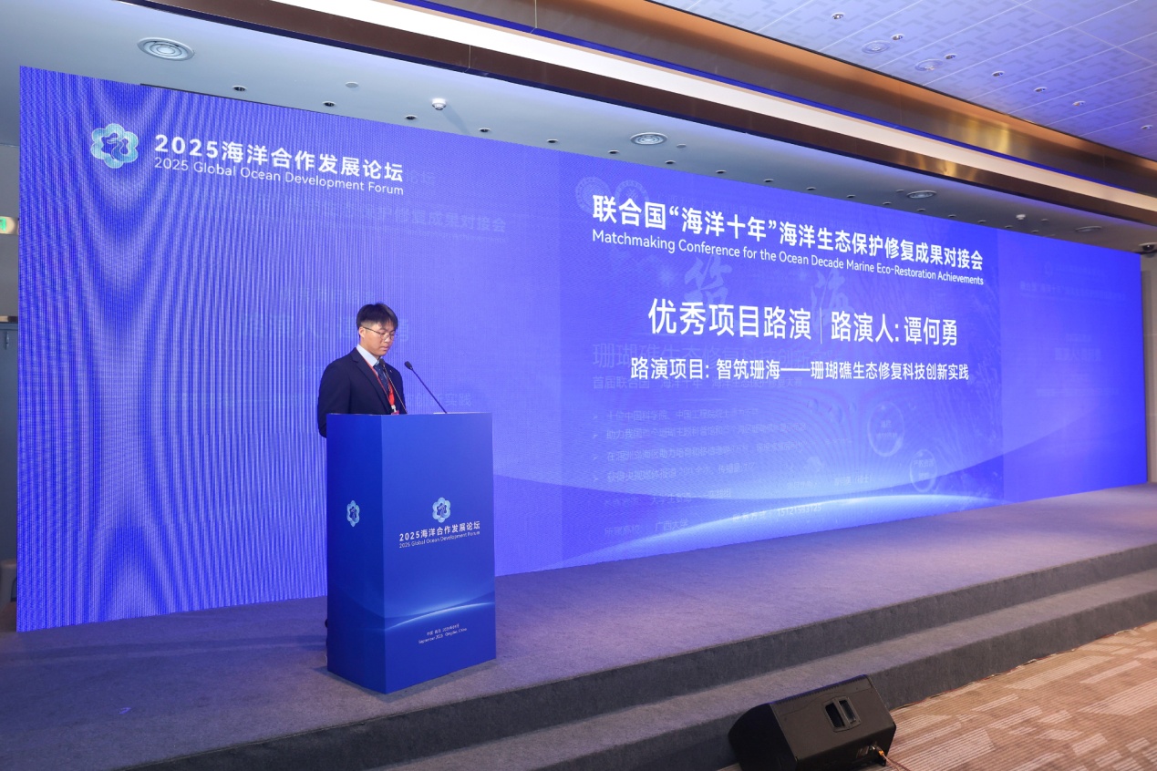其中,《智筑珊海——珊瑚礁生态修复科技创新实践项目》从众多参赛项目中脱颖而出,作为优胜项目在联合国“海洋十年”海洋生态保护修复成果对接会上进行路演展示。该项目团队由14名学生组成——涵盖博士、硕士与本科生。为破解珊瑚礁修复难题,该团队跨越17个纬度、覆盖269个调研站位,通过太平洋、印度洋多航次实地考察,精准锁定技术痛点,历经八年攻坚、32项技术尝试、853次实验迭代,最终突破三大核心技术,构建起“培育—驯化—移植—监测”的全链条解决方案。曾荣获2024年中国国际大学生创新大赛国赛银奖和自治区金奖;第九届“创客中国”广西壮族自治区中小企业创新创业大赛创客组一等奖;以及中国志愿服务项目大赛国赛银奖等。该团队将继续紧跟海洋强国战略,立足广西、面向南海、辐射东盟:深化“人工修复+自然恢复”协同模式,推动蓝碳经济发展;将技术推广至“一带一路”沿线沿海国家,用“中国智慧”助力全球珊瑚礁保护。