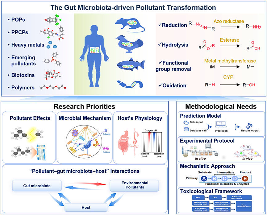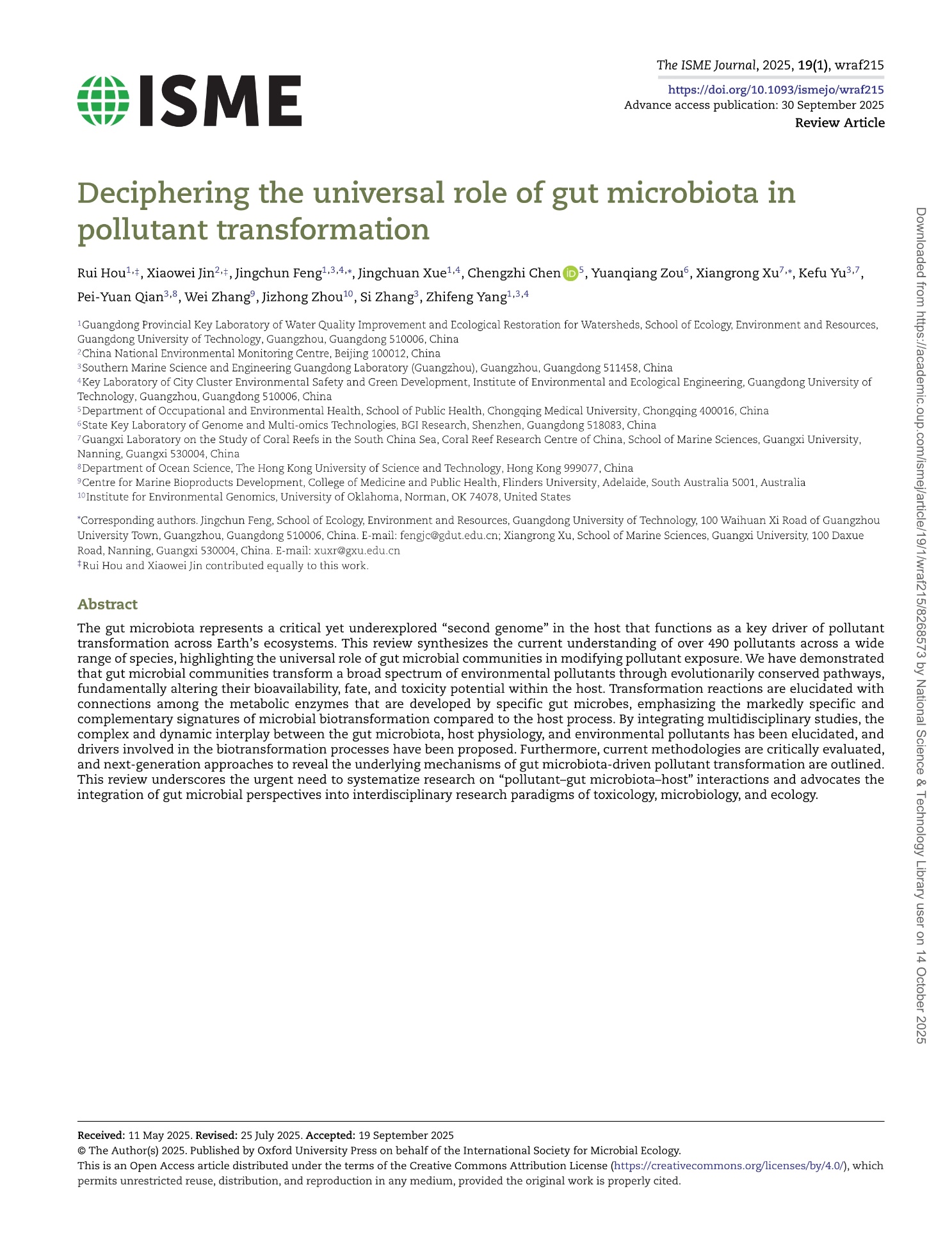 近日,我院携手广东工业大学、中国环境监测总站,在国际微生物生态学领域顶级期刊The ISME Journal(中国科学院一区Top)联合发表评论性综述论文 “Deciphering the Universal Role of Gut Microbiota in Pollutant Transformation(解读肠道微生物在污染物转化中的普遍作用)”。该综述开创性地以“同一个星球,同一个健康(One Planet, One Health)”为研究视角,对涵盖无脊椎动物至人类的13个类群生物的肠道微生物群对490多种环境污染物的转化能力。所涉及的污染物类型广泛,包括持久性有机污染物、重金属、药品和个人护理品、工业添加剂等。此外,论文还明确揭示了肠道微生物群在污染物转化过程中的普遍作用机制,深入探讨了该转化过程对污染物生物利用度、毒性水平及环境归趋的影响。在此基础上,研究团队进一步提出“污染物—肠道微生物群—宿主”相互作用的系统化研究方向,并倡导将肠道微生物的转化能力纳入跨学科研究范式,为相关领域研究提供全新思路。