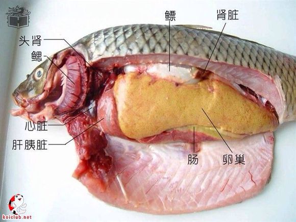 腔:由横隔与腹腔分开。心脏位于围心腔内。在腹腔里,脊柱腹方是白色囊状的鳔,覆盖在前、后鳔室之间的三角形暗红色组织,为肾脏的一部分。鳔的腹方是长形的生殖腺,雄性为乳白色的精巢,雌性为黄色的卵巢。腹腔腹侧盘曲的管道为肠管,在肠管之间的肠系膜上有暗红色、散漫状分布的肝胰脏。在肠管和肝胰脏之间一细长红褐色器官为脾脏。生殖系统由生殖腺和生殖导管组成。