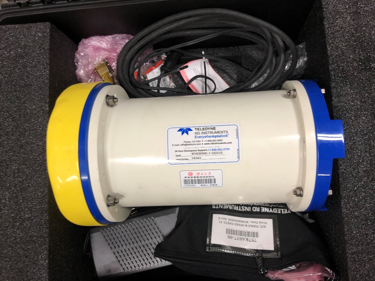 声学多普勒海流剖面仪(简称ADCP)是利用多普勒原理来测量水流流速的仪器,它设计有4个波束,将固定频率的声波发射出去,水流中的微小粒子会以水流的速度运动,由此产生多普勒频率漂移,根据多普勒原理计算出流速和流向的大小。可用于河流、水渠、水库、湖泊、港口、海洋的水流流量或流速的测量。我院配备有2台ADCP,工作声学频率分别600kHz和1200kHz。