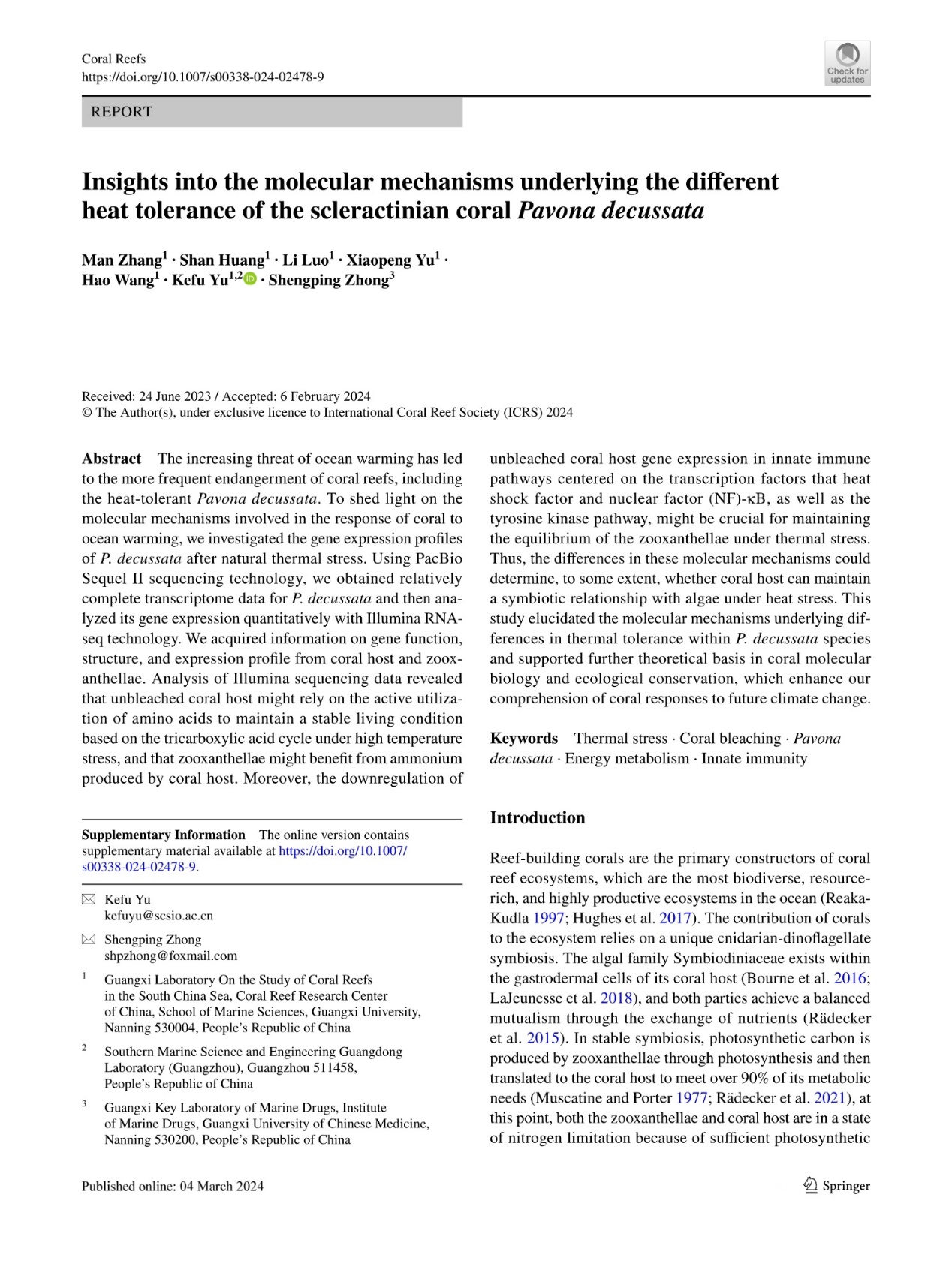 Zhang Man, Huang Shan, Luo Li, Yu Xiaopeng, Wang Hao, Yu Kefu, Zhong Shengping. (2024). Insights into the molecular mechanisms underlying the different heat tolerance of the scleractinian coral Pavona decussata. Coral Reefs. doi:10.1007/s00338-024-02478-9