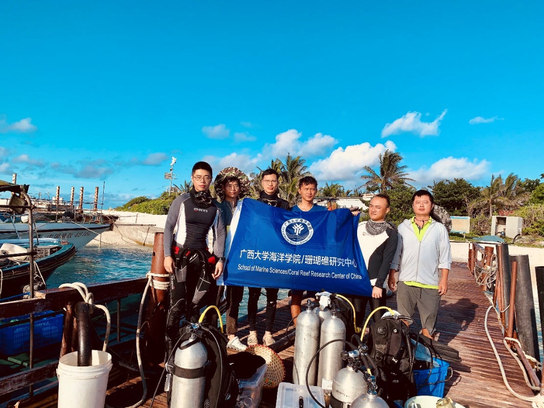 The "Blue Dream" scientific expedition team organized the 2023 comprehensive scientific expedition to Yongle Atoll of Xisha Islands (left: Dr. Chen Biao; Second from left: Xia Ronglin, PhD candidate; Third from Left: Dr. Qin Zhenjun)